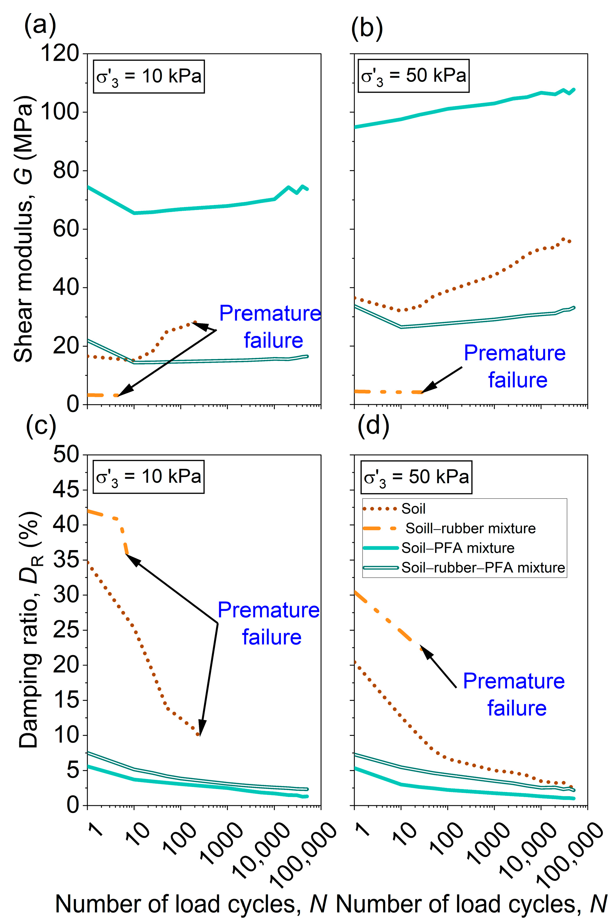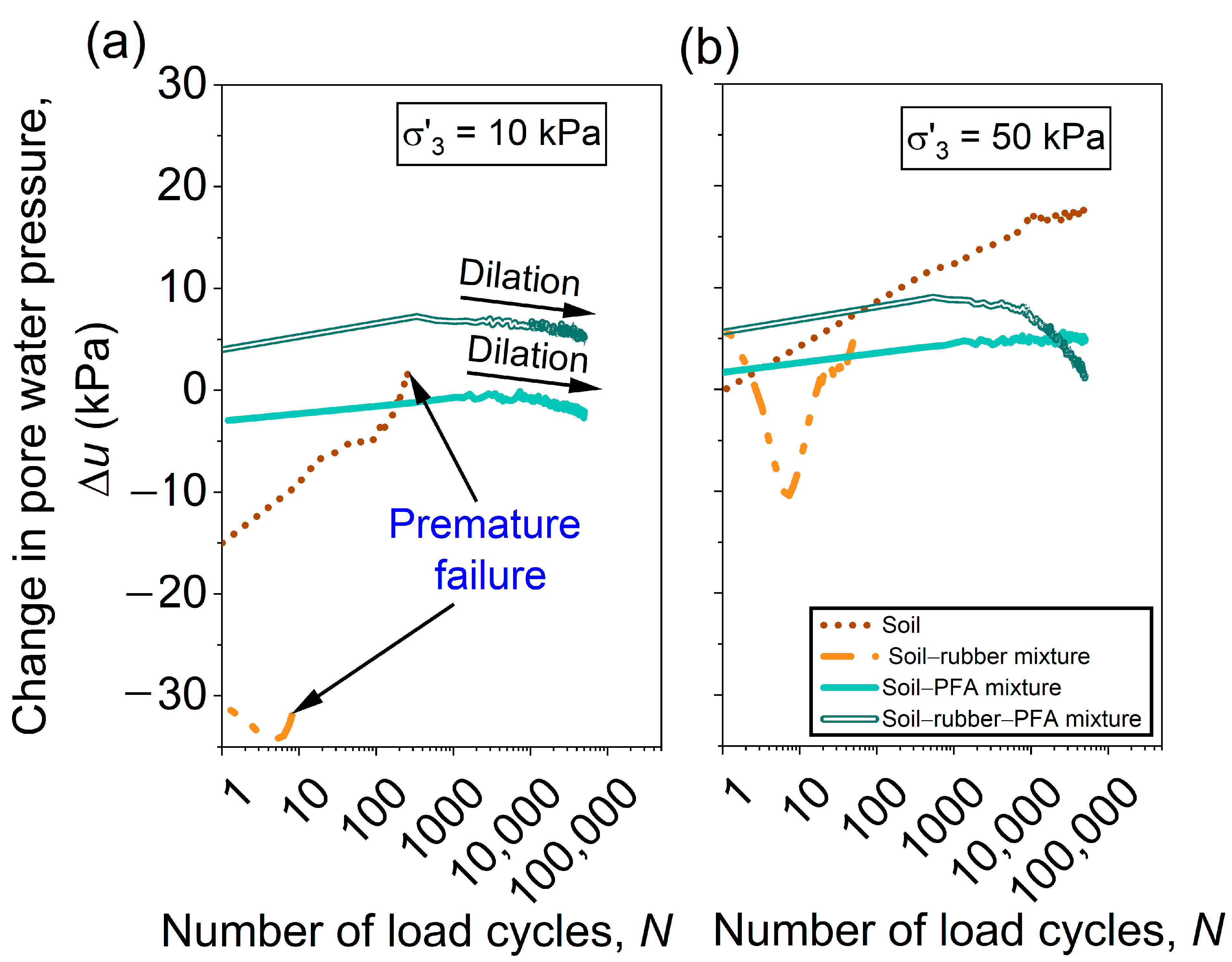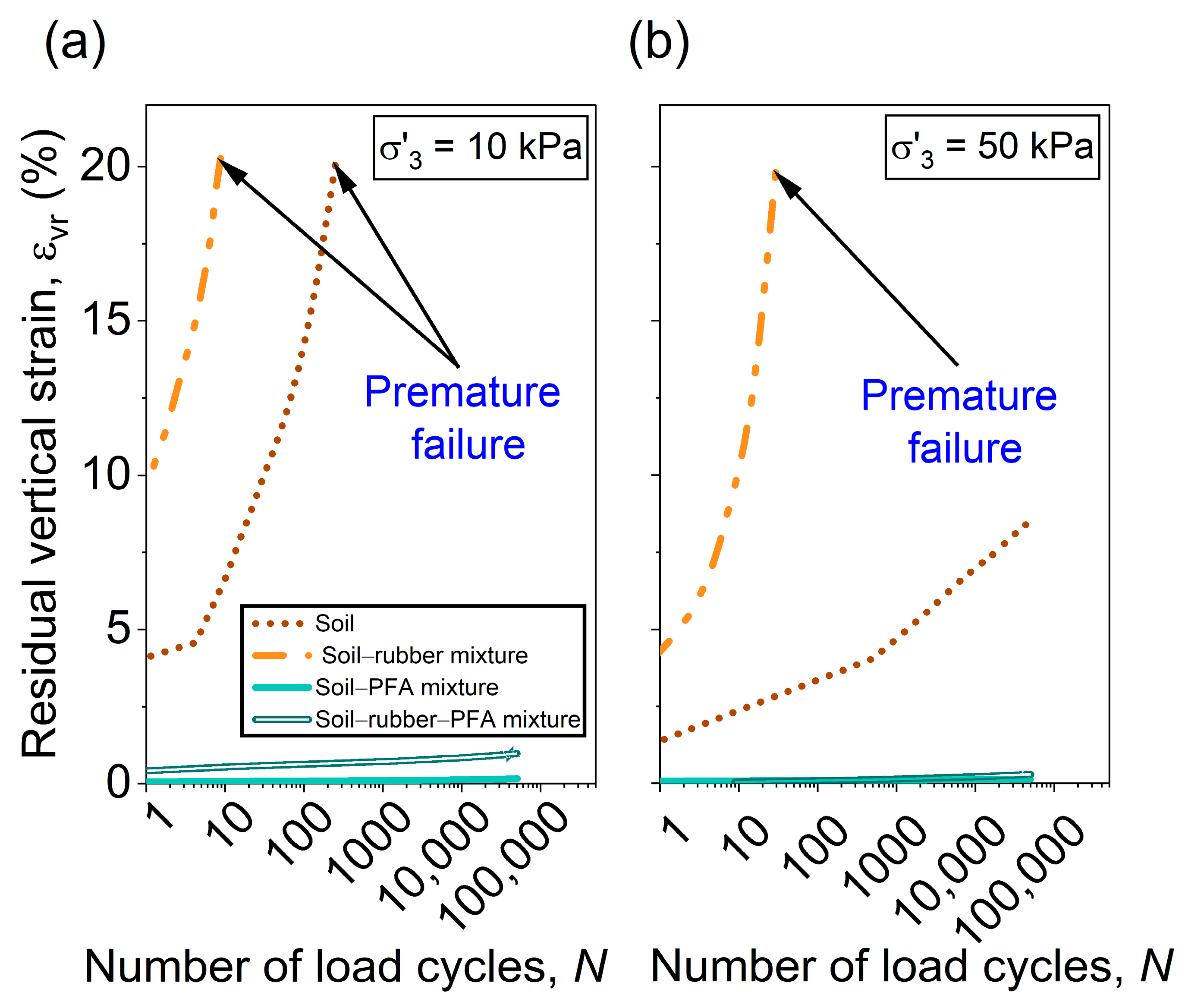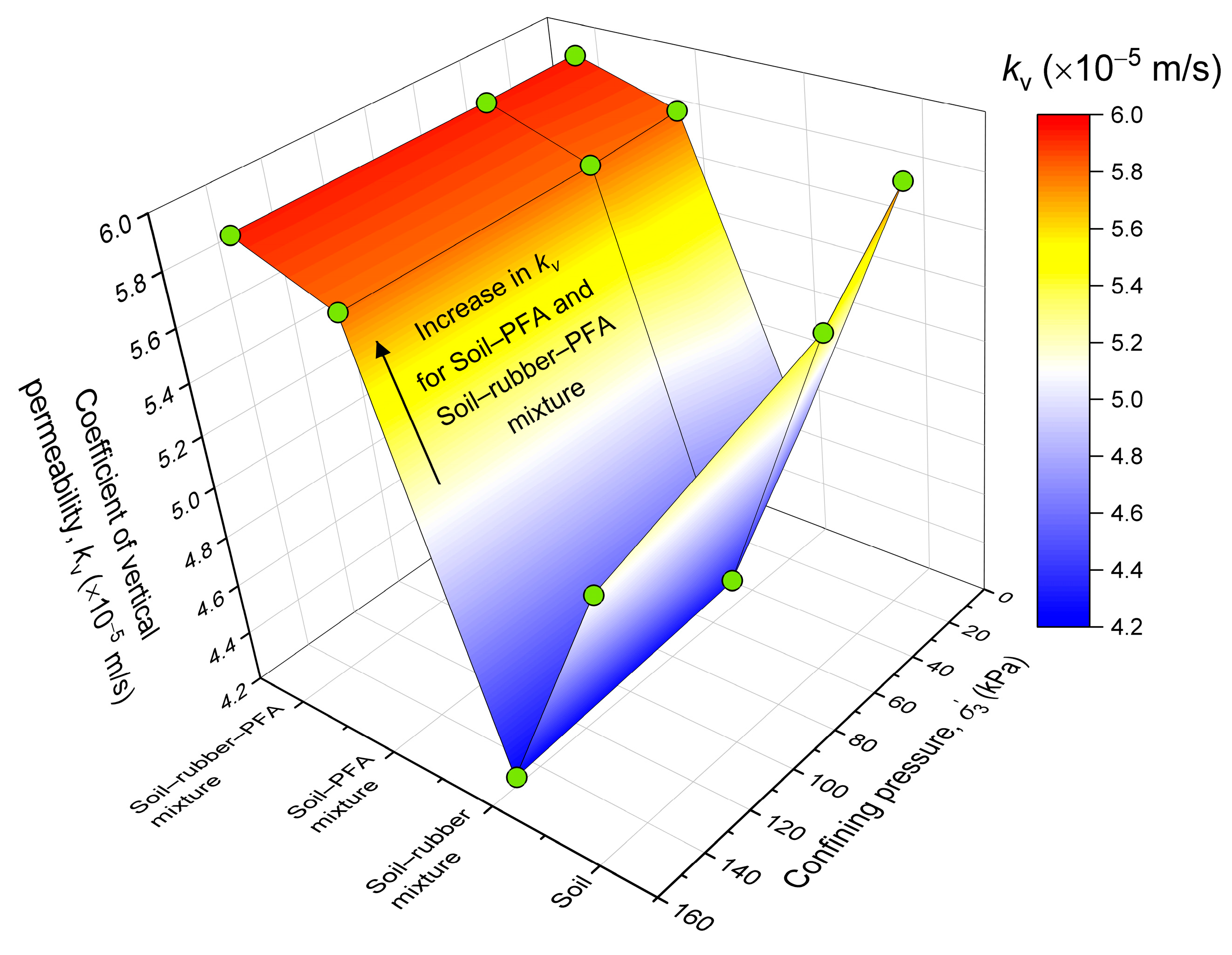The coefficient of vertical permeability for different mixtures was also determined at the end of the consolidation stage before cyclic loading. After completion of the consolidation stage, a significant reduction in was observed for untreated soil and soil–rubber mixture. This reduction in was due to a decrease in the void ratio of the sample, which occurs during consolidation. The reduction in increased with an increase in . Insignificant changes in were observed for the soil–PFA and soil–rubber–PFA mixtures. Also, did not influence of these PFA-treated mixtures. Thus, using these treated mixtures in the base layer of ballastless railway tracks would avoid the build-up of excess pore pressure by offering an uninterrupted water flow under varying confinement levels.