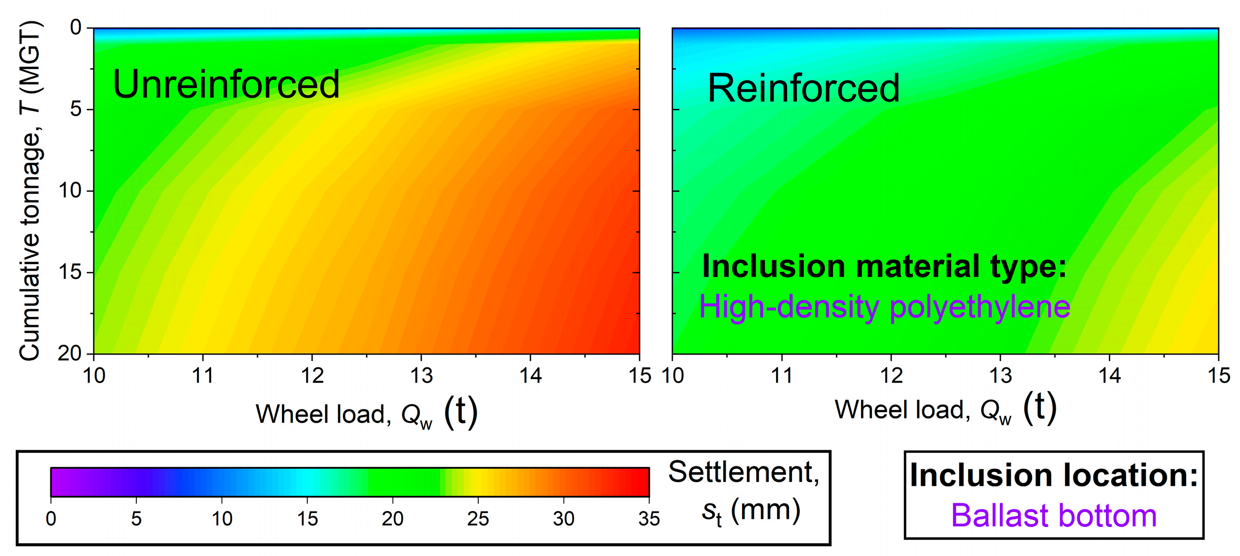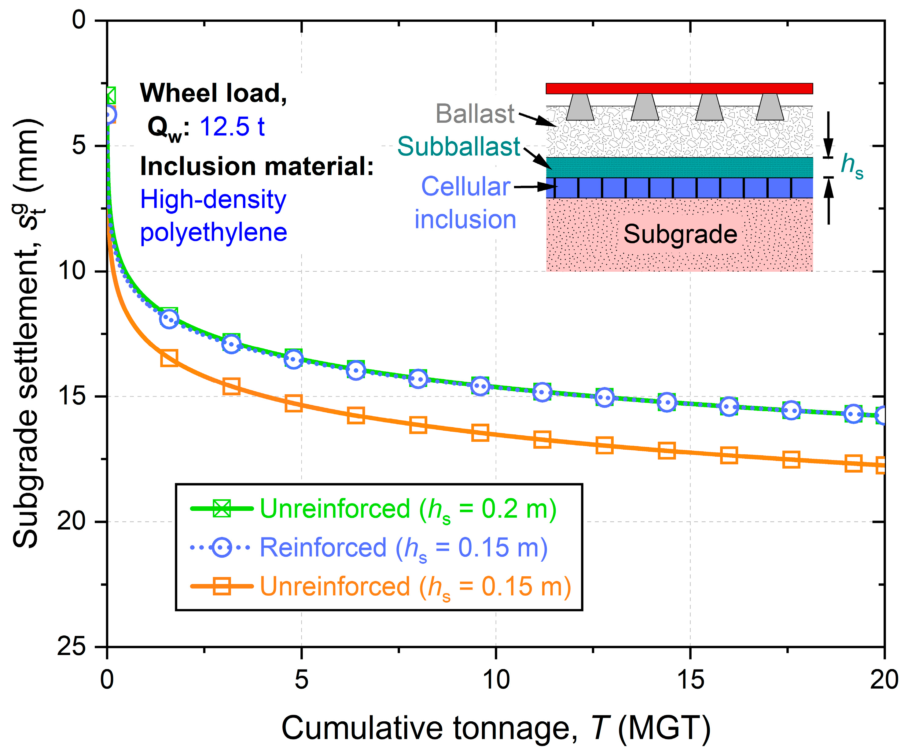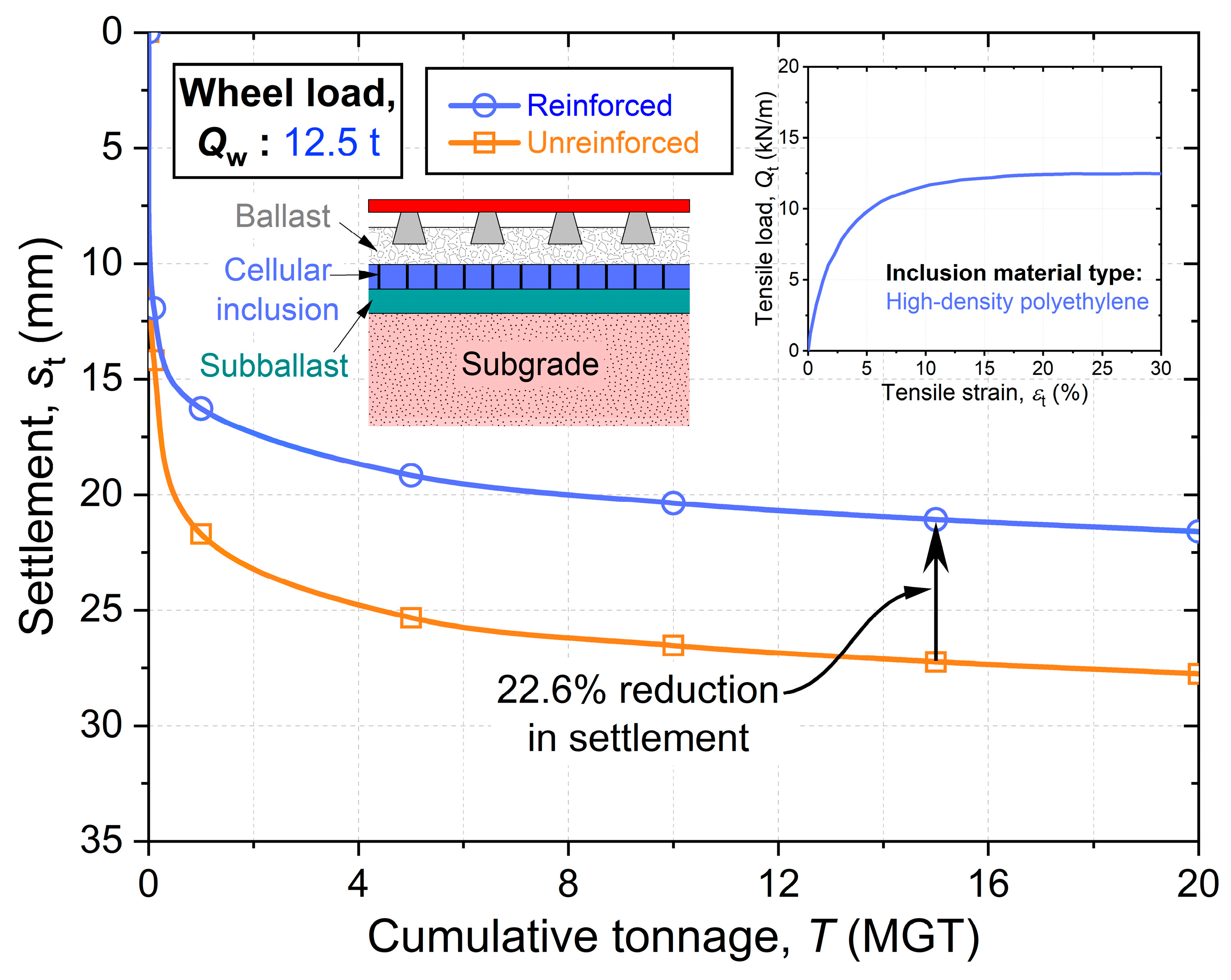 Results from a rheological computational approach highlighted that the use of cellular artificial inclusions could significantly reduce cumulative settlement (by up to 33%) and material usage in ballasted railway tracks. This could potentially lead to lower maintenance requirements and reduced carbon emissions. Their effectiveness under higher load levels demonstrates their potential for enhancing the resilience of railway infrastructure against future load escalation.