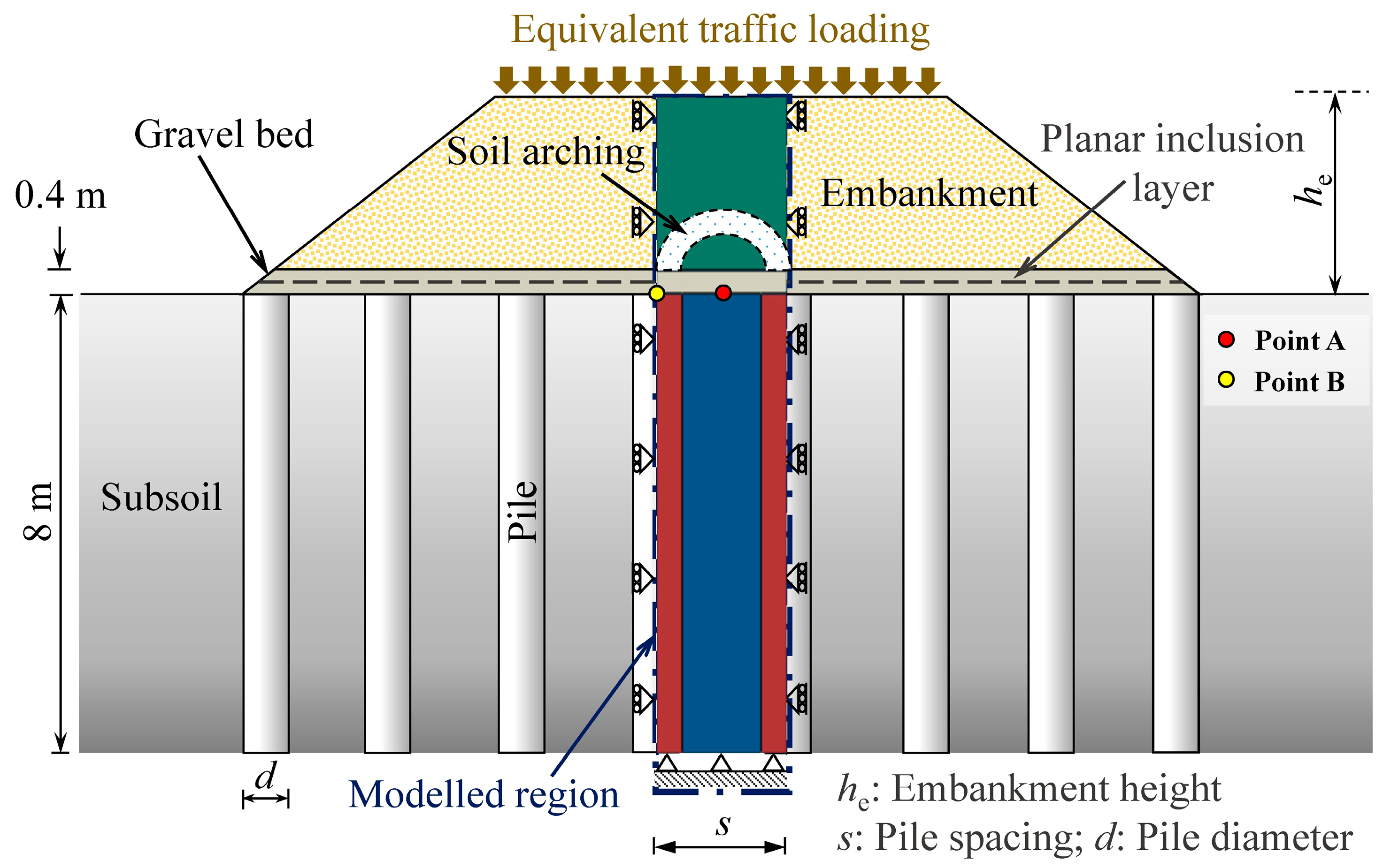A pile-supported embankment with and without a planar inclusion layer was analyzed under two-dimensional (2D) plane strain conditions using the FE method.