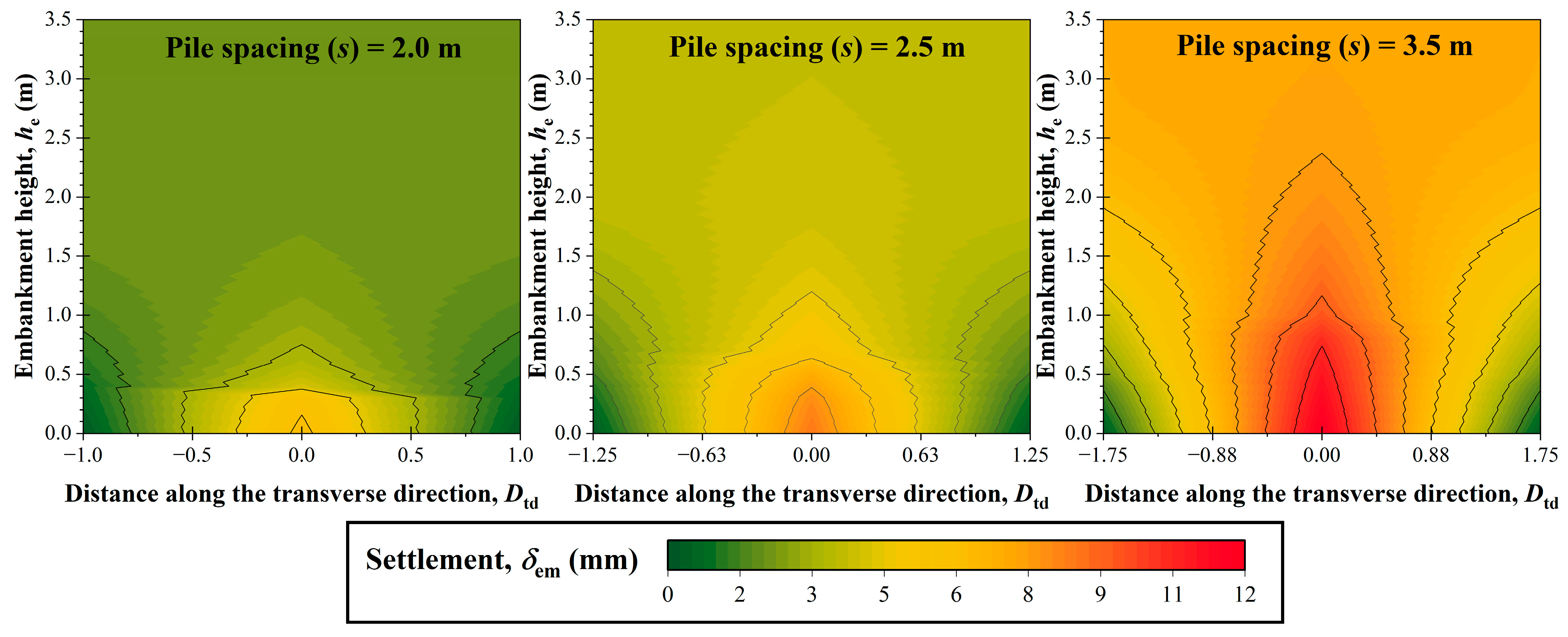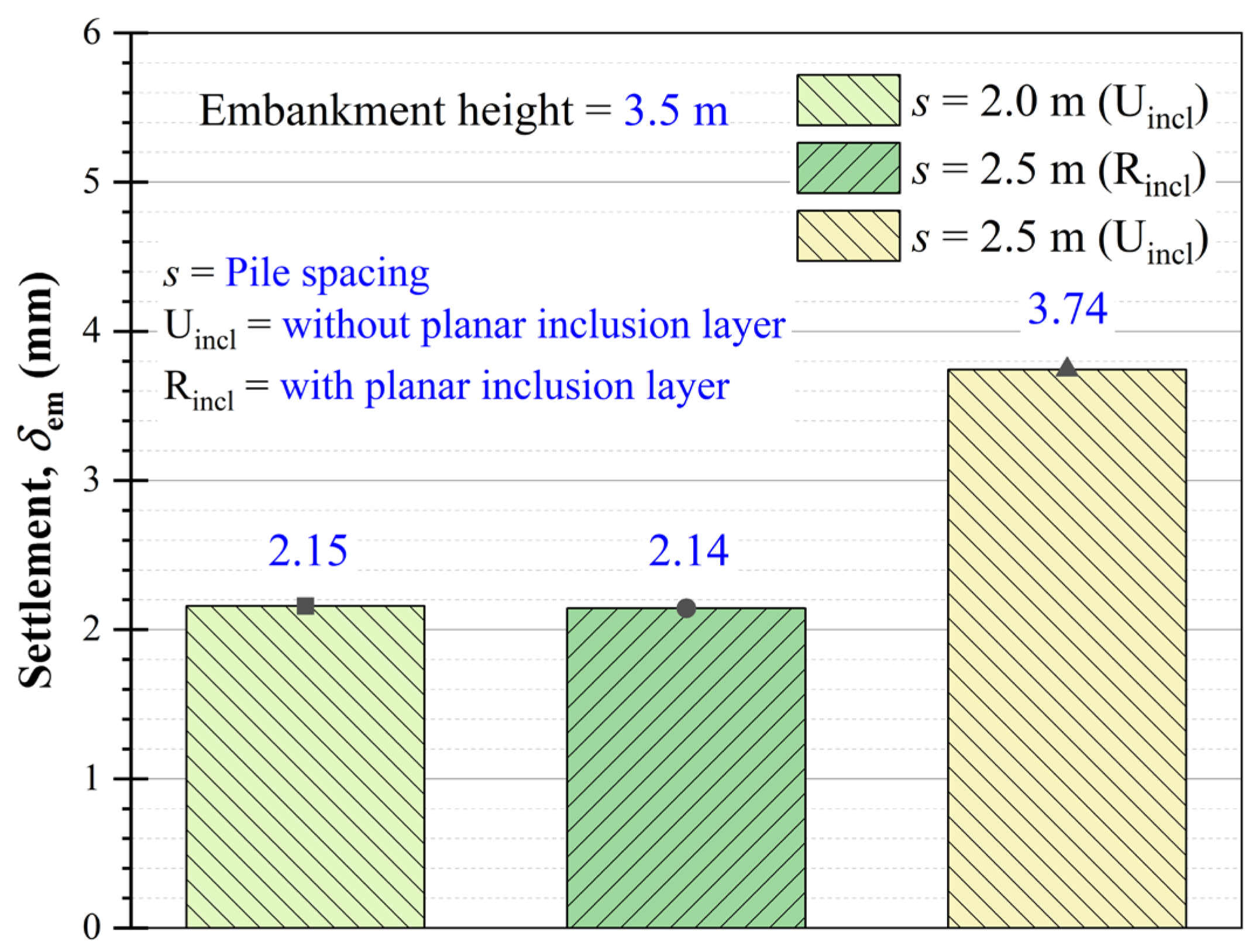 Figure 20 that the use of planar inclusions reduces the settlement at the embankment top by around 43% at a pile spacing of 2.5 mm. A similar reduction in settlement with the incorporation of inclusions was reported in [
