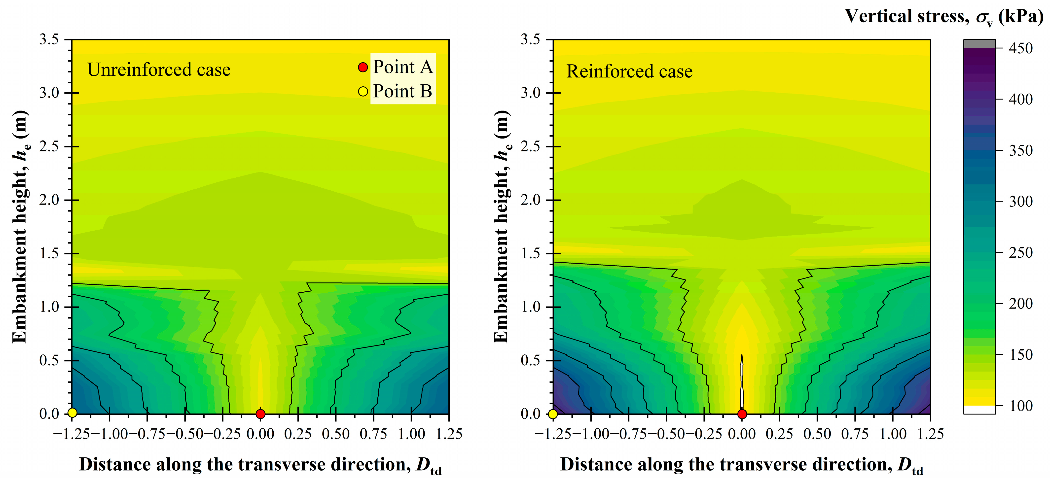 he = 3.5 to 2 m and then decreases from 2 to 0.5 m along a section passing through point A. Meanwhile, the vertical stress progressively increases from the embankment top to the bottom along a section passing through point B. Thus, the vertical stress within the embankment fluctuates, decreasing at Point A and increasing at Point B, within the height range of 0.5 to 2 m. This region is referred to as the load transfer zone.