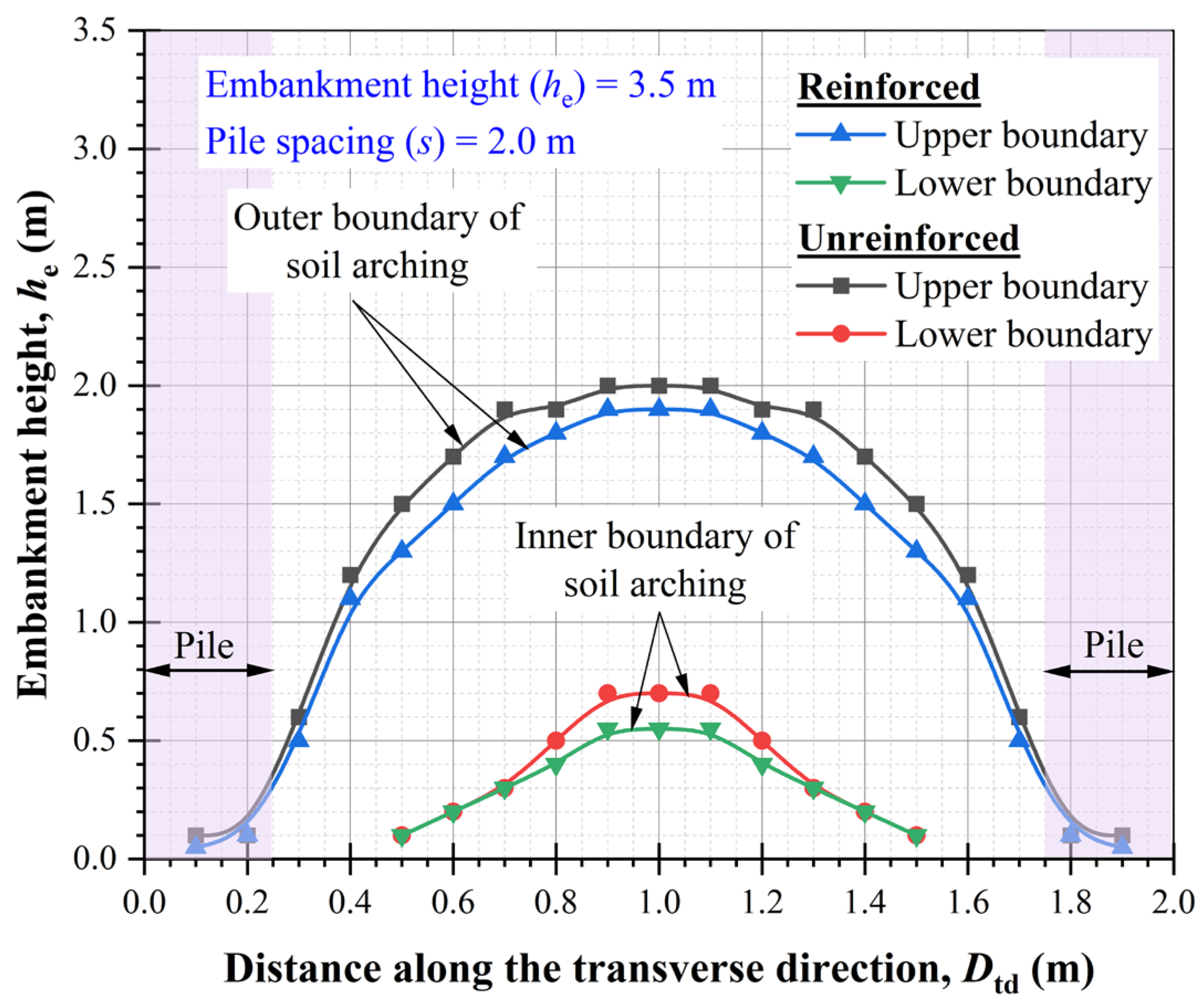 42] reported that the incorporation of a planar inclusion significantly reduced differential settlement between piles and subsoil, as the inclusion carried a part of the load through tension generated within it. Several studies have investigated the role of planar inclusions in improving load-transfer mechanisms in PSRE. Their effectiveness in reducing subsoil settlement and improving load transfer to piles has been shown to depend on factors such as embankment height, pile spacing and pattern, subsoil properties, vehicle speed, inclusion stiffness and the number of inclusion layers [