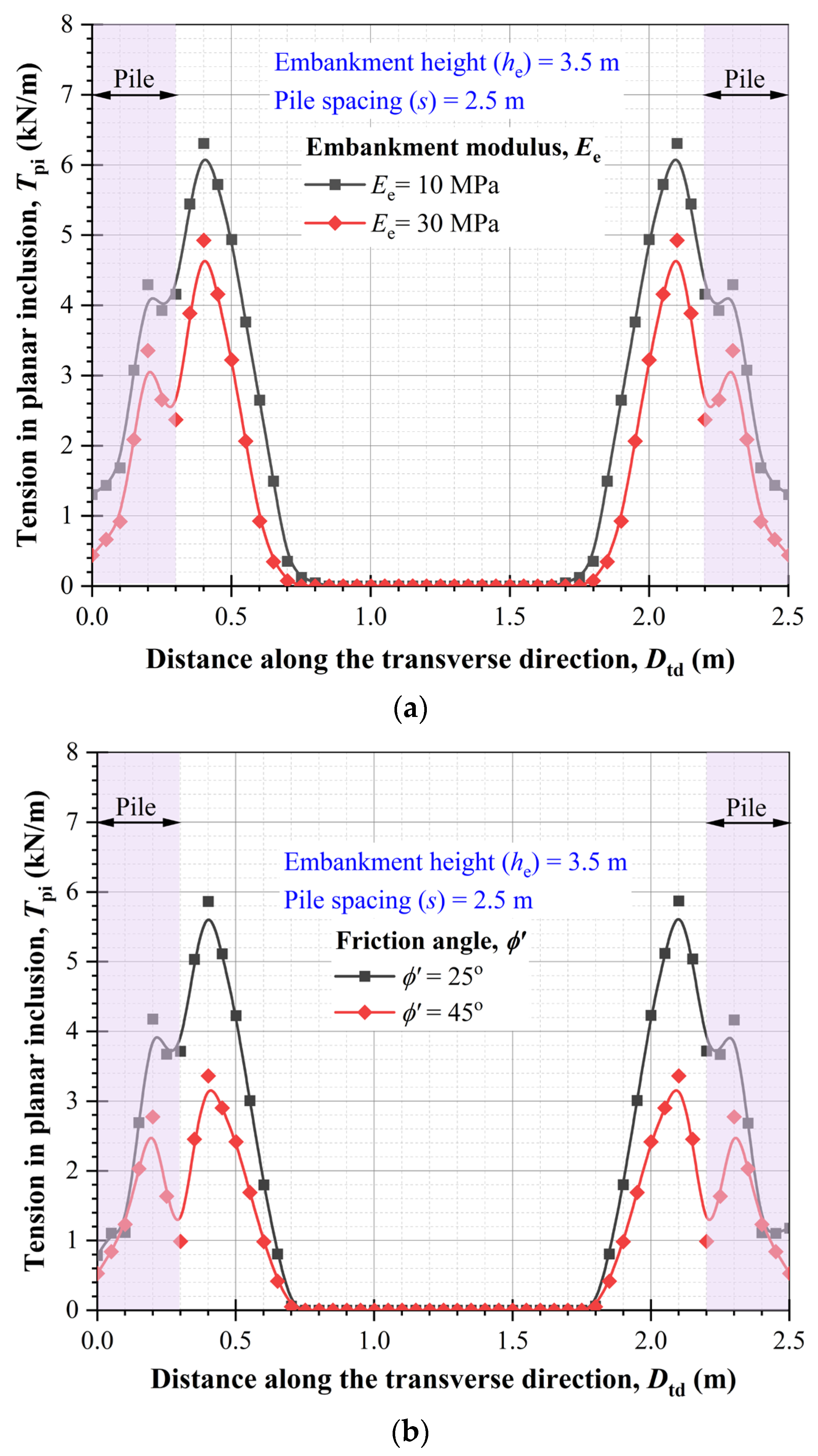 Tpi by approximately 54%. This reduction in tension can be ascribed to the improved strength and stiffness of the embankment fill, which minimizes settlement, and consequently, the demand for planar reinforcement. These findings suggest that when