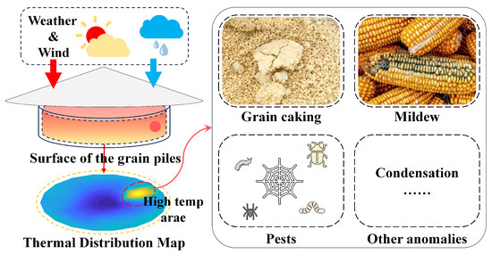 In grain storage management, temperature monitoring and prediction have become widely adopted and effective strategies to ensure safety [2]. Temperature monitoring enables the early identification of abnormal hot spots, thereby locating risk-prone areas within complex grain pile environments [3,4,5]. Figure 1 shows the grain condition in case of local high-temperature anomaly (the most common temperature anomaly). To mitigate such risks, dedicated drying devices [6] and Internet of Things-based sensor technologies [7,8,9] have been increasingly applied for monitoring temperature and humidity inside warehouses. As illustrated in Figure 2, the surface region of grain piles responds rapidly to external environmental fluctuations and often serves as the earliest indicator of abnormal conditions. Consequently, the accurate prediction of surface temperature plays a critical role in early warning systems for grain storage.