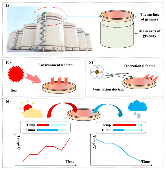 Grain piles surface temperature variation: (a) Granary area division. (b) Environmental influence: solar radiation. (c) Operational influence: ventilation control. (d) Surface temperature trend under different weather conditions.