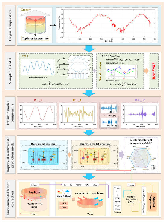 The evolution of grain pile surface temperature is driven by internal dynamics and strongly modulated by external environments. Accordingly, this study develops a VMD-SampEn-vLSTM model based on historical temperature series, then incorporates environmental factors via multivariate regression to refine the prediction results.