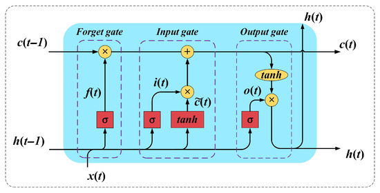 LSTM, a specialized variant of RNNs, introduces gated mechanisms to effectively mitigate the vanishing and exploding gradient problems commonly encountered in long sequence modeling [30]. The architecture of the LSTM cell is illustrated in Figure 4. Comprising a forget gate, an input gate, and an output gate, this architecture enables LSTM to selectively retain memory and discard information. Therefore, this study uses LSTM to perform parallel prediction on multiple modal sequences after VMD decomposition.