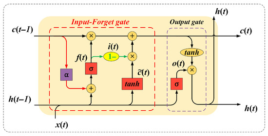 However, when the input to an LSTM model consists of multiple time-series variables, its original gating mechanism may exhibit limited coordination in handling inter-variable heterogeneity, making it difficult to effectively differentiate and adapt to the dynamic characteristics of each variable. This limitation stems from the fact that, in the standard LSTM architecture, the input gate and forget gate operate independently to regulate the writing of new information and the retention of past information, respectively. This lack of constraint and mutual regulation may lead to conflicts and redundancy during the information update process. Moreover, the gating operations in the original LSTM primarily rely on the previous hidden state , while the cell state can only be indirectly utilized via , which restricts the model’s ability to directly perceive and leverage historical context, ultimately affecting its modeling capacity for multimodal time-series data.