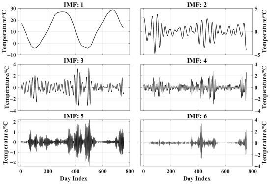 In Section 4, this study proposes a VMD parameter selection method based on the Sample Entropy (SampEn) evaluation metric. Building upon this, the current section applies the method to the surface temperature series of a grain pile, aiming to extract dynamic features across multiple temporal scales and to establish a solid foundation for subsequent temperature prediction tasks.