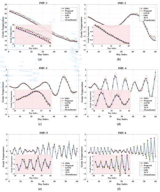 Forecasting results for IMFs using different models: (a) IMF1. (b) IMF2. (c) IMF3. (d) IMF4. (e) IMF5. (f) IMF6.