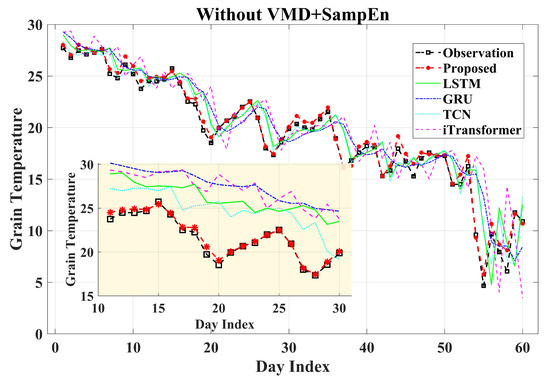 Figure 11 presents a comparison between models with and without the decomposition. The results indicate that the direct modeling approach exhibits a clear prediction lag during the fitting stage and fails to effectively track rapid fluctuations, whereas the incorporation of VMD-SampEn decomposition significantly enhances both fitting accuracy and responsiveness to dynamic variations.