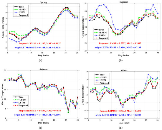 To further assess the long-term prediction capability, an additional experiment was conducted on a 300-day test dataset. Representative cases from April, July, October, and January were selected to reflect the four seasons under the granary’s climatic conditions. As shown in Figure 12, the vLSTM consistently outperforms the standard LSTM, delivering notably higher accuracy. More importantly, the proposed prediction framework achieves prediction accuracy improvements exceeding 50% over the baseline LSTM across all periods, thereby demonstrating strong robustness and stability under diverse seasonal conditions.
