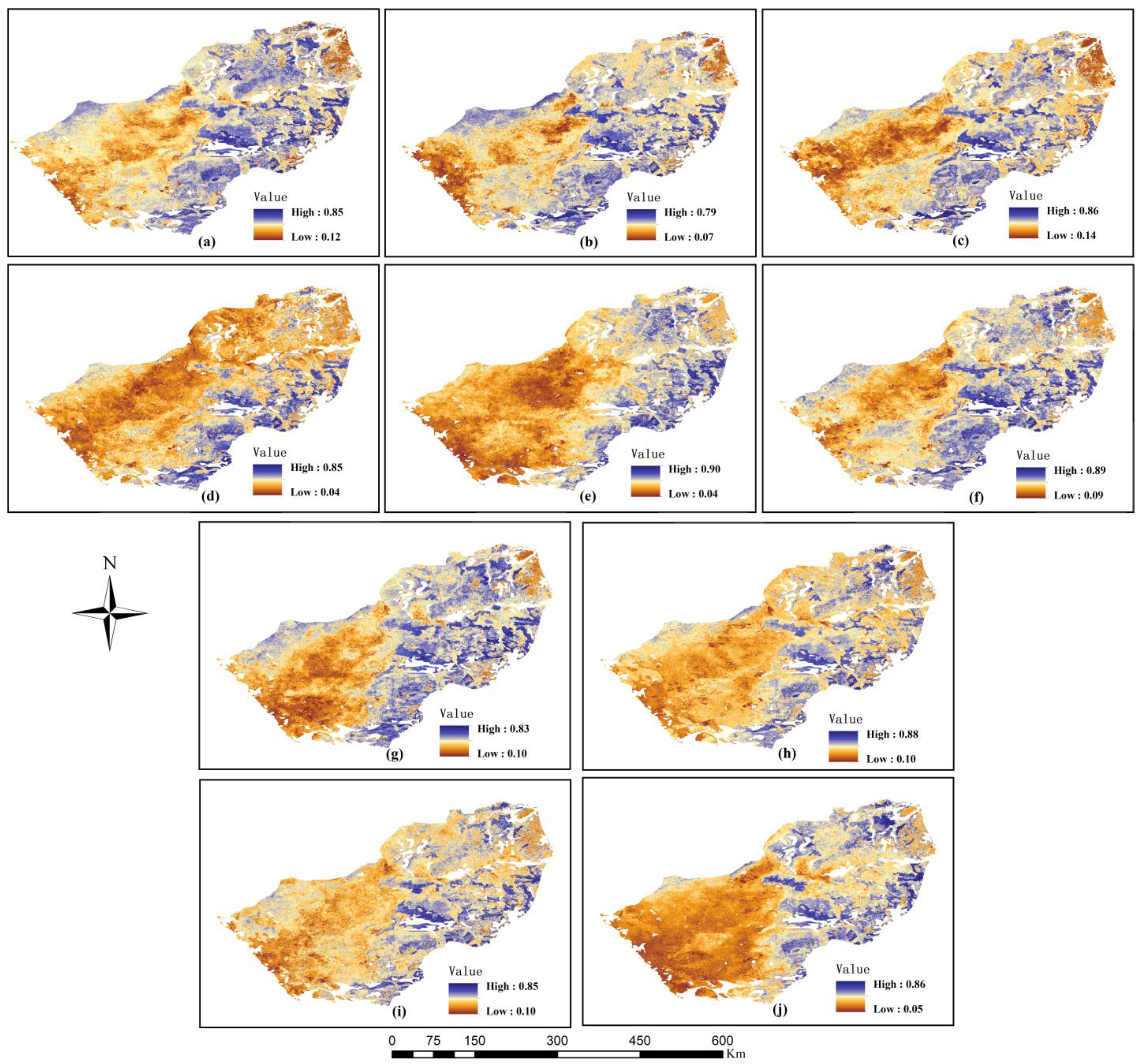 - Wang, S.; Cui, D.; Wang, L.; Peng, J. Applying Deep-Learning Enhanced Fusion Methods for Improved NDVI Reconstruction and Long-Term Vegetation Cover Study: A Case of the Danjiang River Basin. Ecol. Indic. 2023, 155, 111088. [Google Scholar] [CrossRef]
