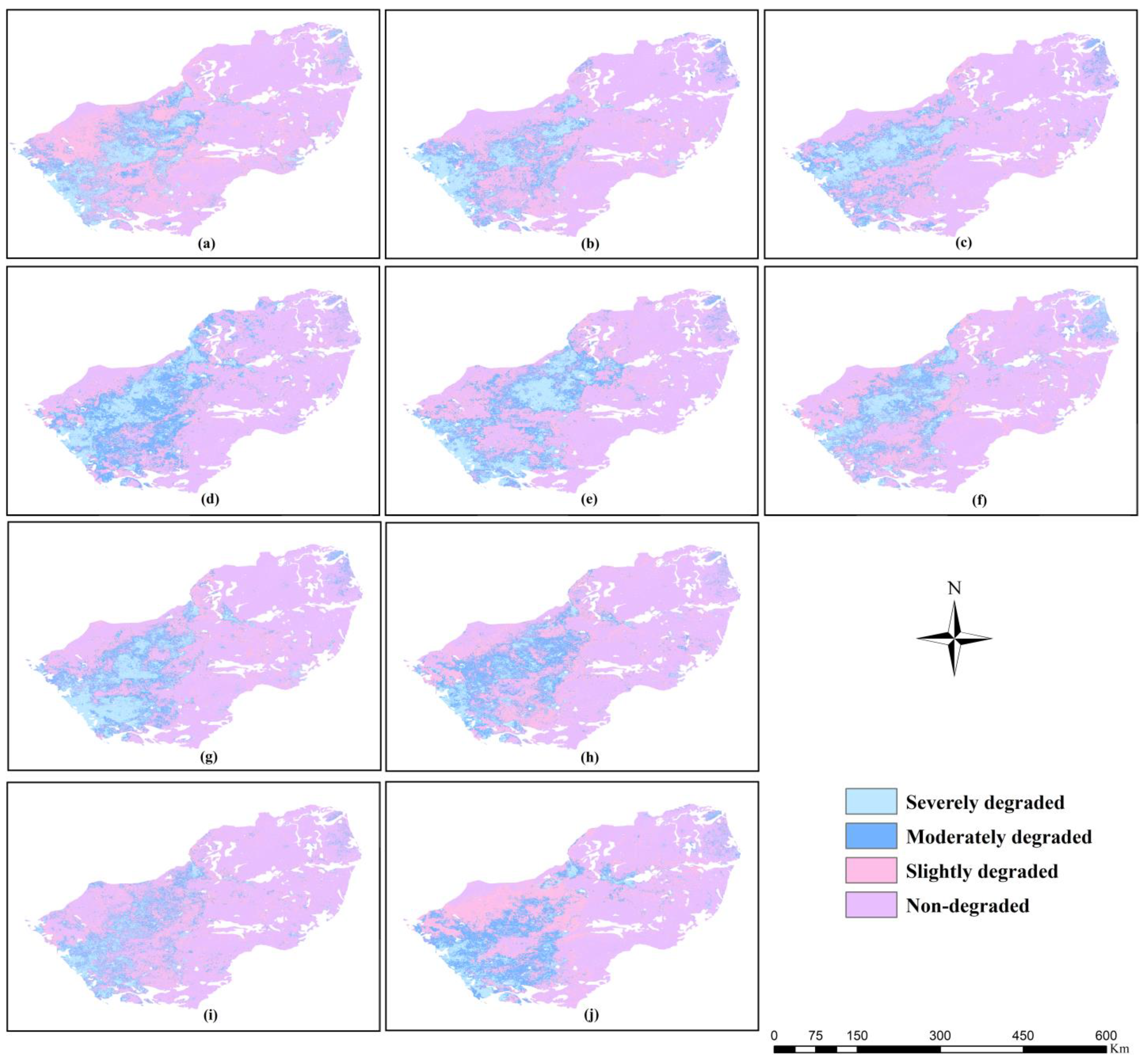 4.2. Spatial and Temporal Analysis of the Current Status of Steppe Degradation