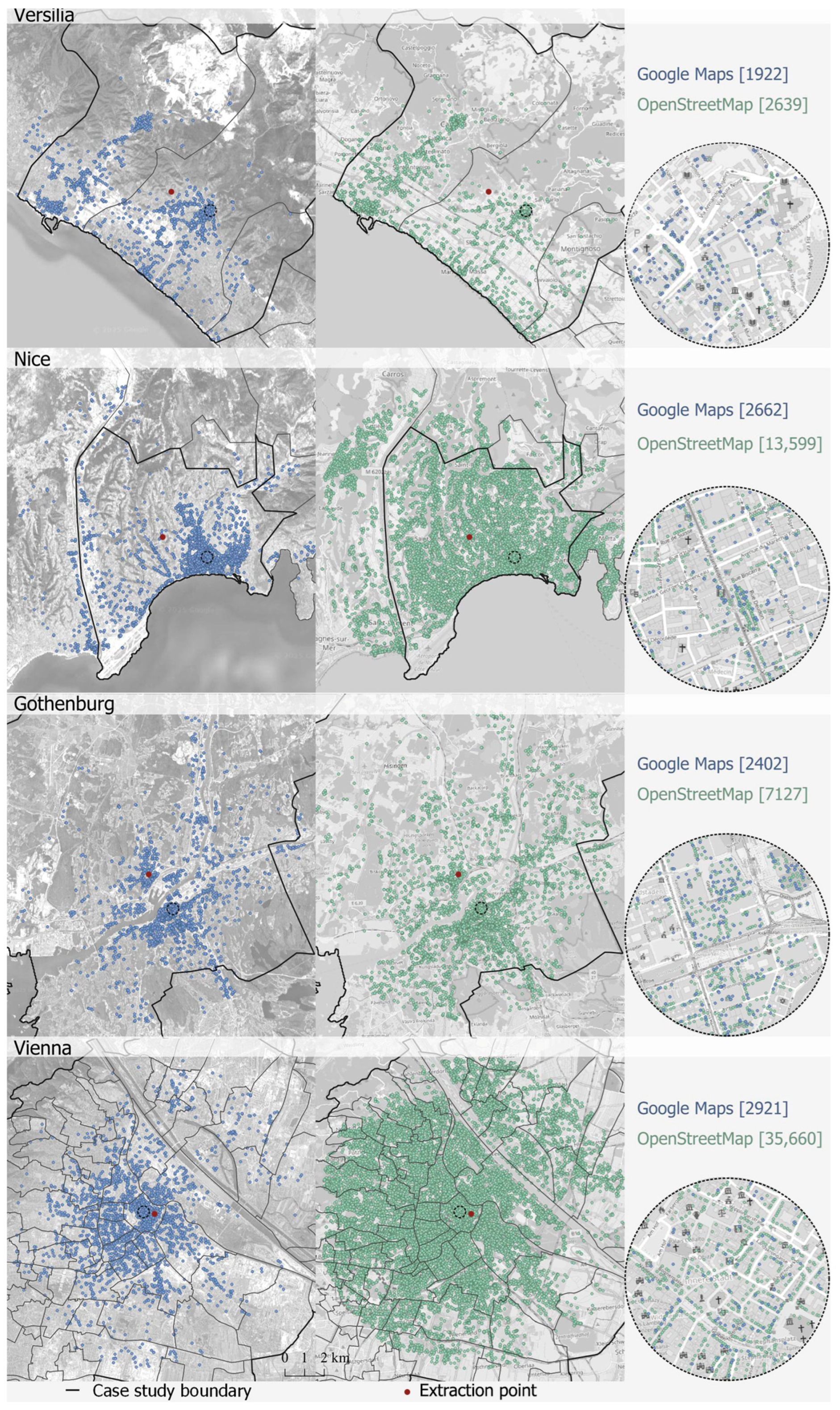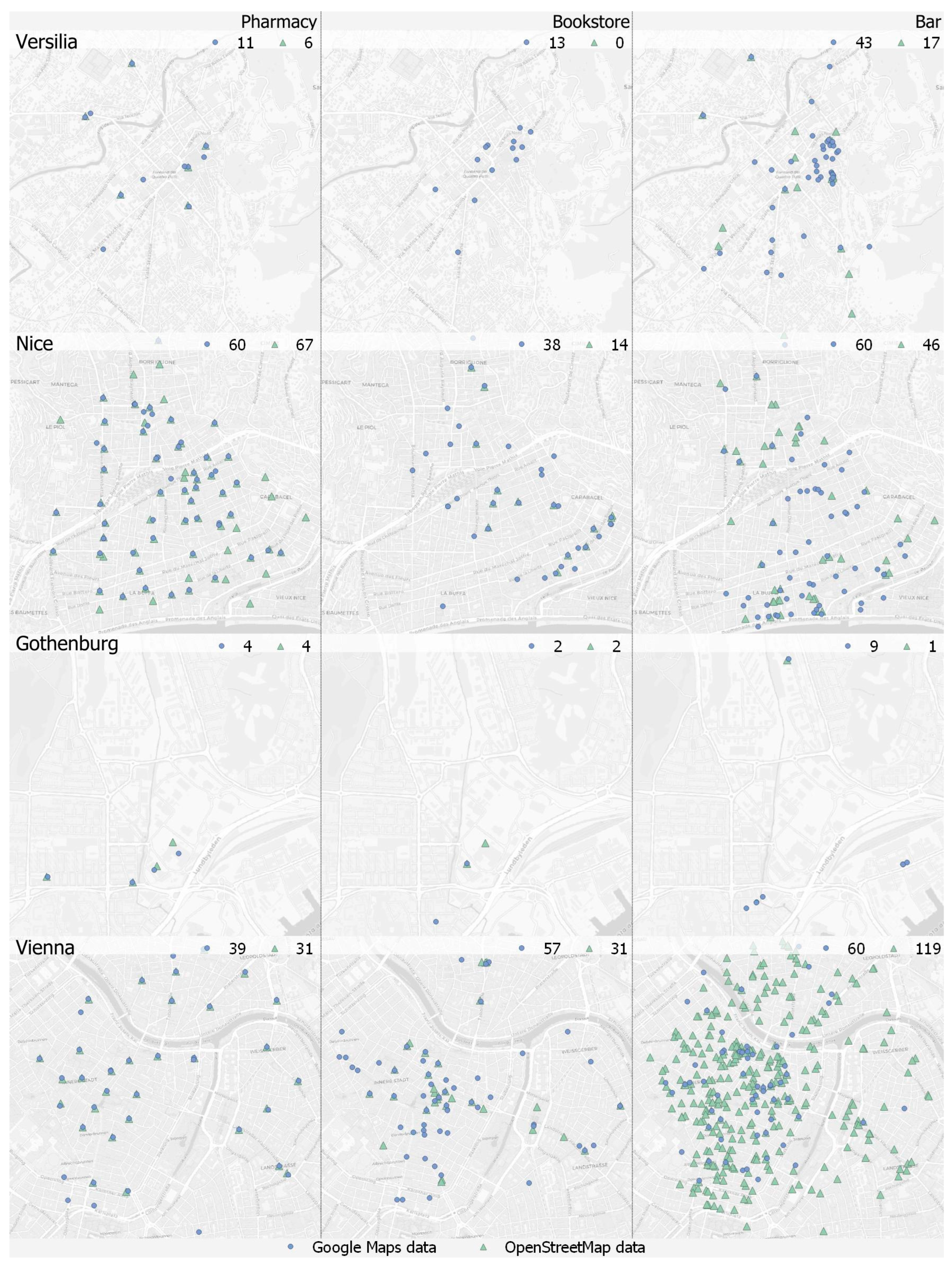 Figure 2). The largest discrepancies occur in Nice and Vienna, where OSM produces more than twice the number of entries returned by GM. Gothenburg exhibits a smaller yet substantial gap, while in Versilia the two datasets yield comparable totals.