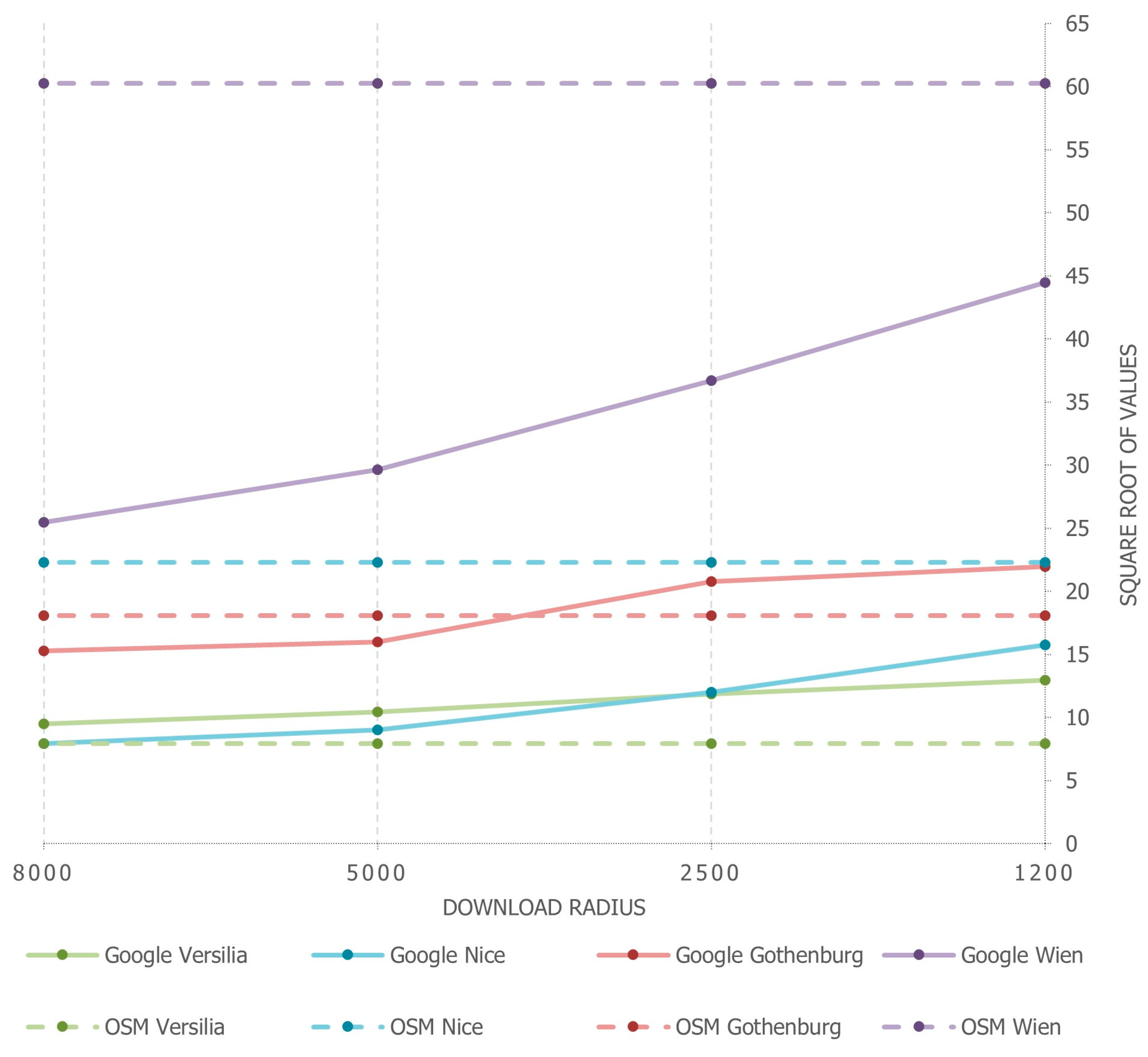 Figure 3). Within these clipped areas OSM consistently exceeds Google Maps in Vienna and Nice, while Google Maps exhibits greater density in Gothenburg and Versilia at smaller radii. This indicates a key architectural difference:
