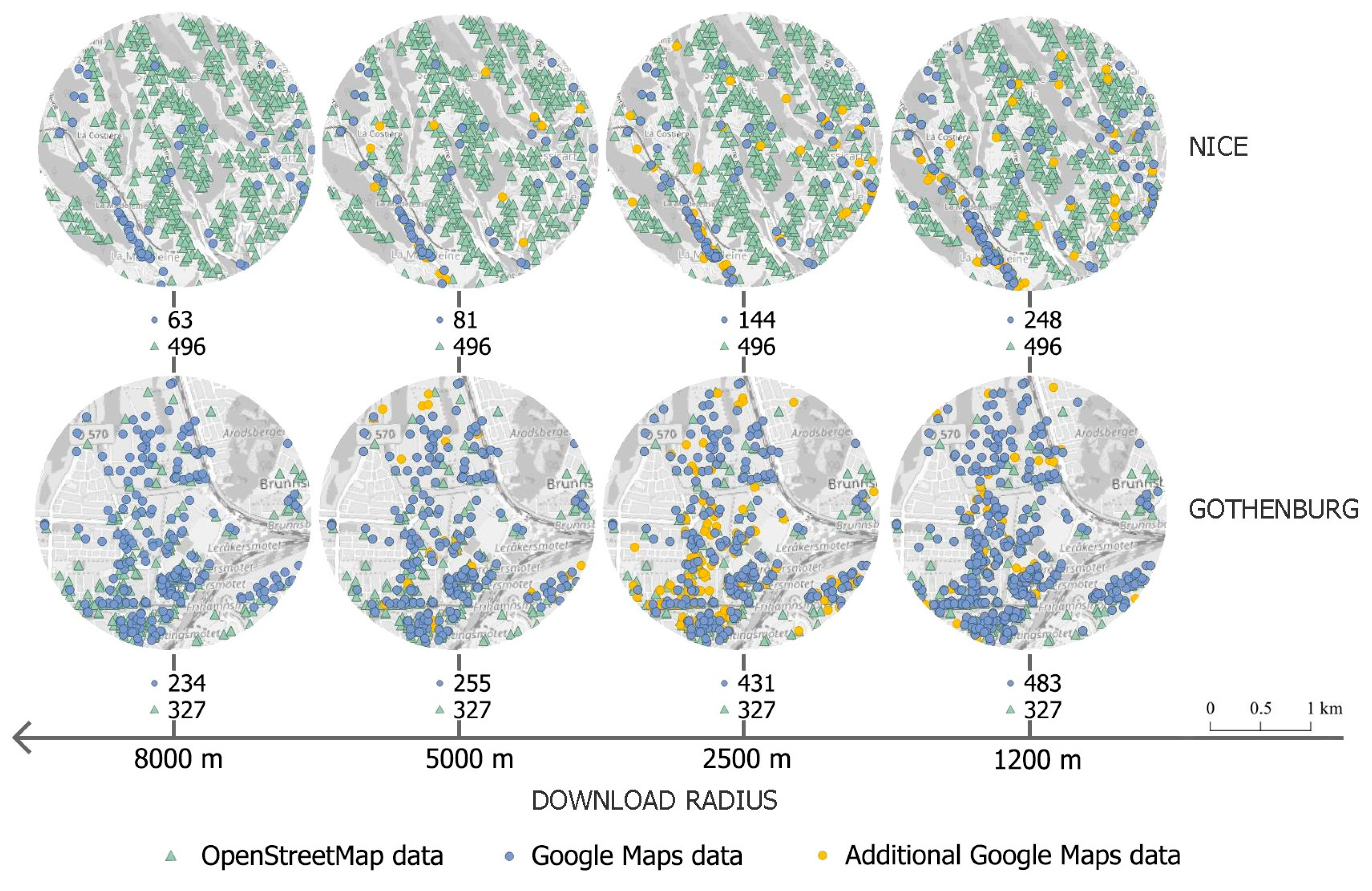 To assess how spatial extent influences dataset completeness, amenities were extracted from Google Maps and OSM across concentric buffers of 8000, 5000, 2500, and 1200 m from the original extraction points. While