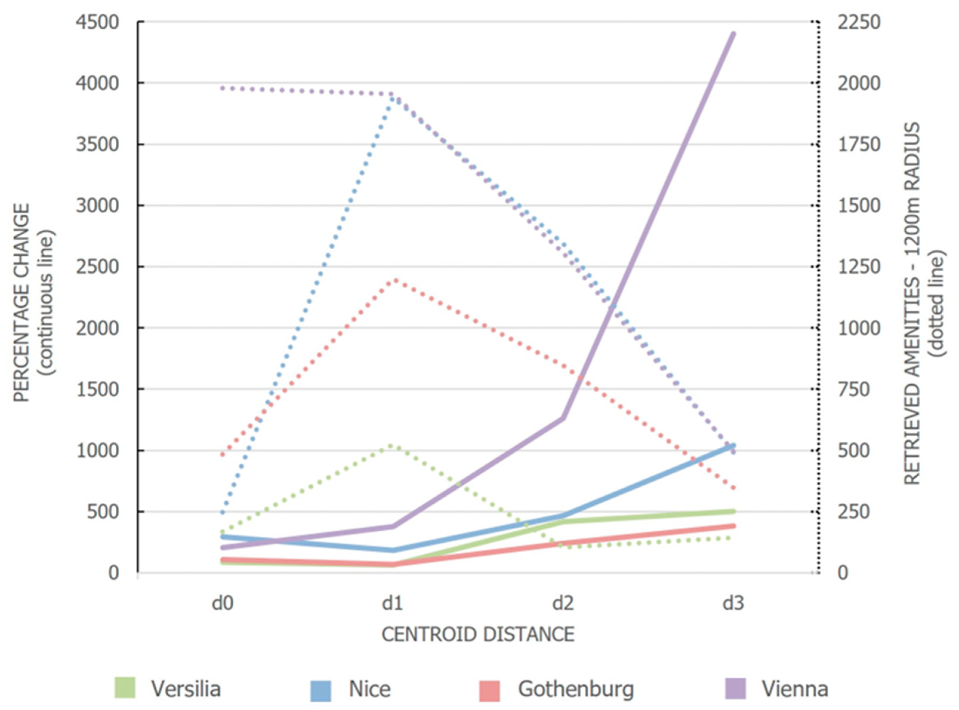 PlaceType per request. Consequently, in high-density zones where specific categories surpass this threshold, the downloaded dataset underrepresents the actual amenity landscape available within Google’s full database. This limitation likely contributes to the non-monotonic behaviour of the Percentage Change function observed in Nice, Gothenburg, and Versilia—where the number of POIs retrieved at