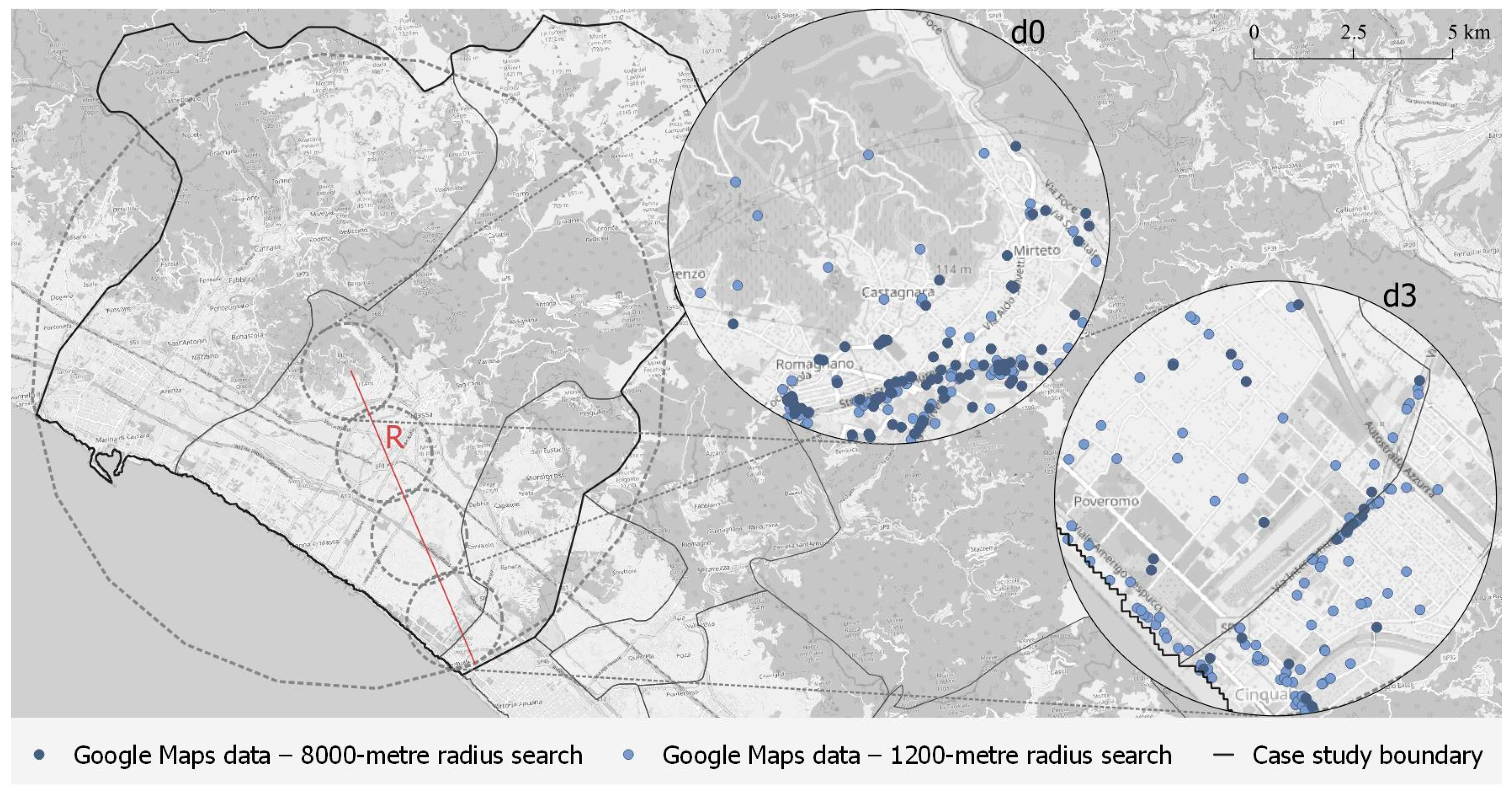 Overall, these findings highlight a critical limitation in using Google Maps for urban-scale bulk downloads: broader-radius queries introduce distortions, especially at the periphery, due to algorithmic biases and ranking filters. In contrast, downloads with a smaller radius yield more accurate and spatially consistent datasets, although they may still be affected by additional category-related distortions, as highlighted by Anselmi et al. [