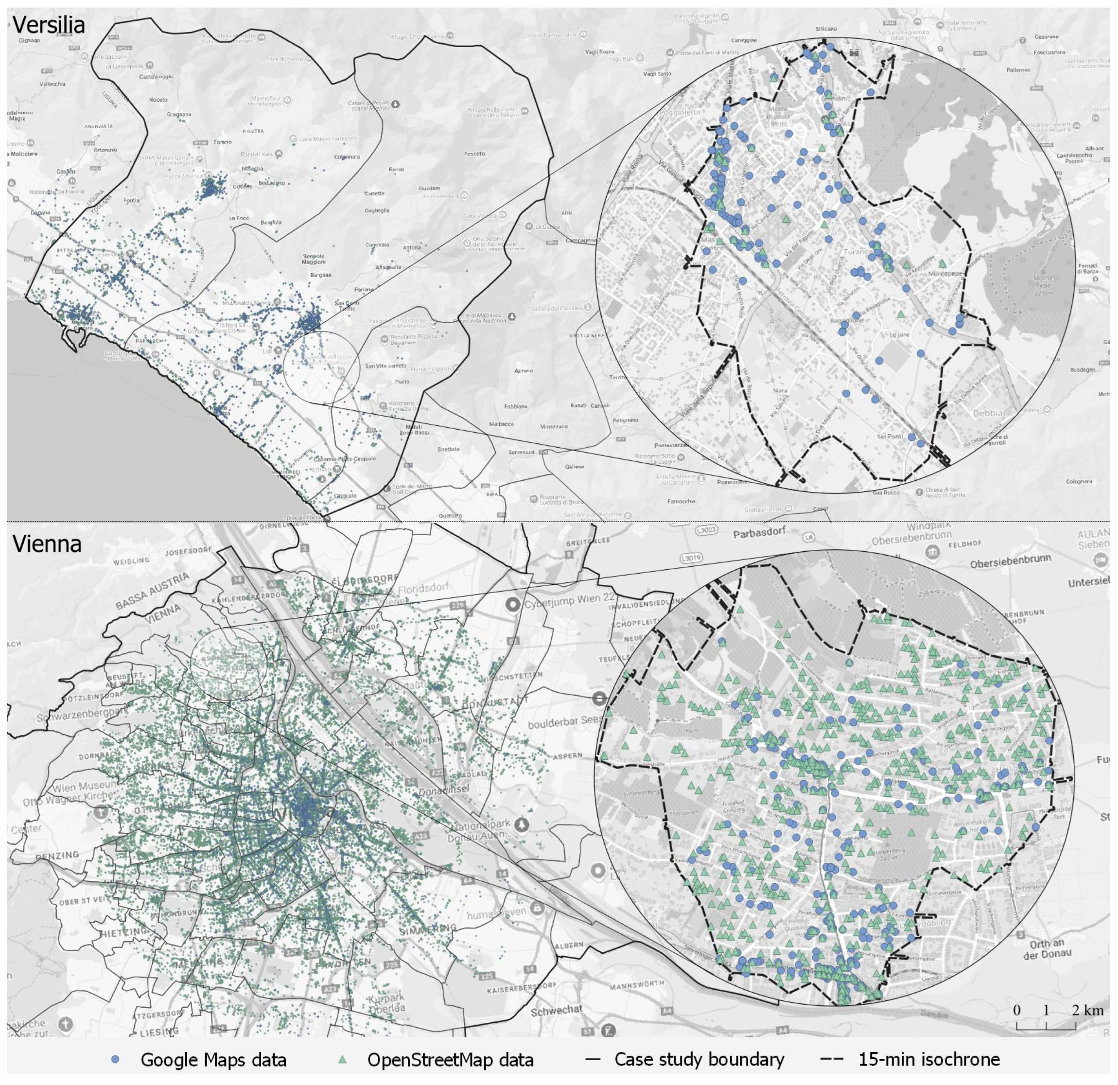 Table 7, in Versilia all considered categories are well represented in Google Maps, with a marked prevalence of retail and trade activities—an aspect that does not emerge from OpenStreetMap. In Vienna, the strong presence of sport facilities—driven primarily by the inclusion of private swimming pools (specifically, 485 out of 518 sport-related entries)—suggests a distinct sporting vocation for the area. In contrast, Google Maps indicates a predominance of commercial activities and health services. A further layer of complexity arises from entries assigned to ambiguous or residual categories such as “other” or “generic”. These encompass activities either not explicitly requested or lacking precise semantic attribution, rendering them unclassifiable within the adopted framework. Their presence not only complicates comparison between datasets but also underscores the risk of overestimating functional richness due to poorly defined or inconsistently applied tags.s5.4.4. Implications for ModellingsUltimately, the reliability of proximity-based urban models—whether for the 15-min city or similar frameworks—depends on three intertwined conditions: