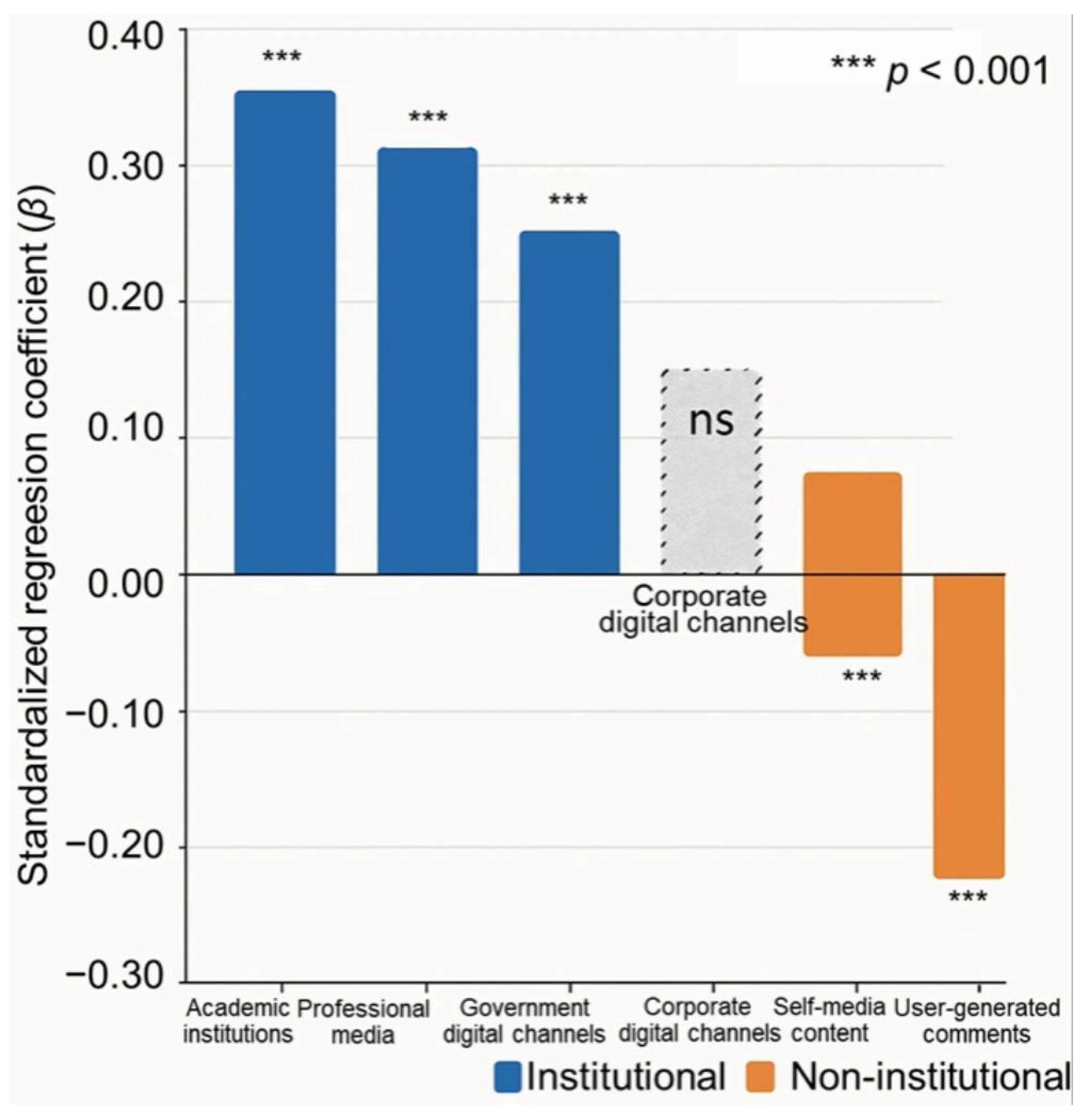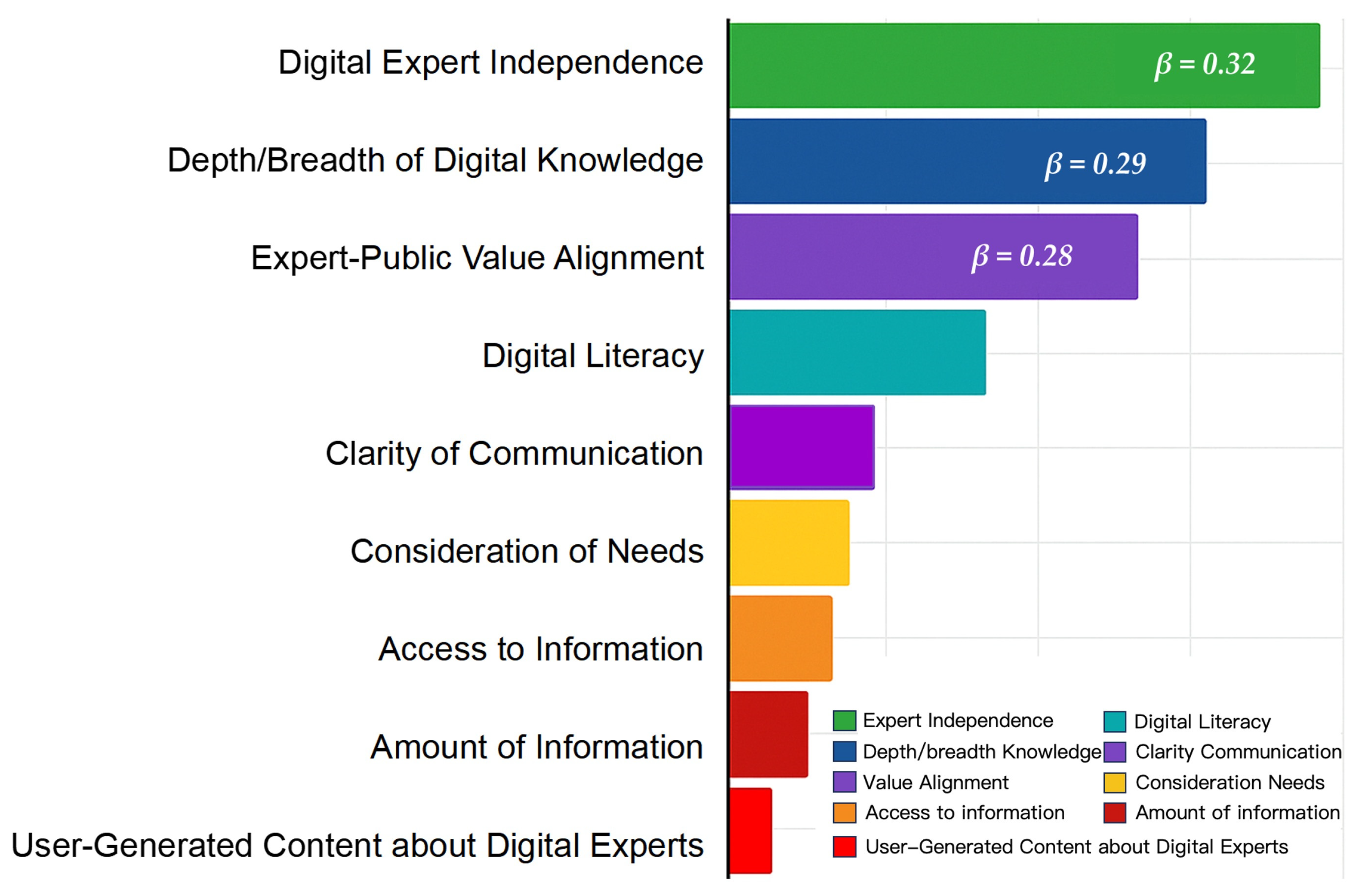 Finally, the study incorporated several control variables to account for potential confounding influences on digital transformation trust. These included demographic variables such as age (reflecting potential digital generation gaps), gender, and education level (influencing digital literacy), as well as measures of general social trust (obtained from the CGSS data) and digital media literacy (measured using a separate scale). These control variables were included in the regression models to isolate the specific effects of the independent variables on expert trust in digital transformation contexts.