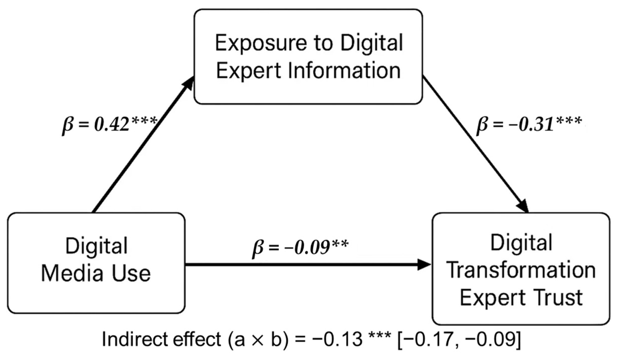 The indirect effect (mediation effect), representing the extent to which social media use influences expert trust through exposure to expert information, is calculated as the product of a and b (a × b). Bootstrapping (with 5000 resamples) was used to estimate the 95% confidence intervals for the indirect effect. If the confidence interval does not include zero, the mediation effect is considered statistically significant.