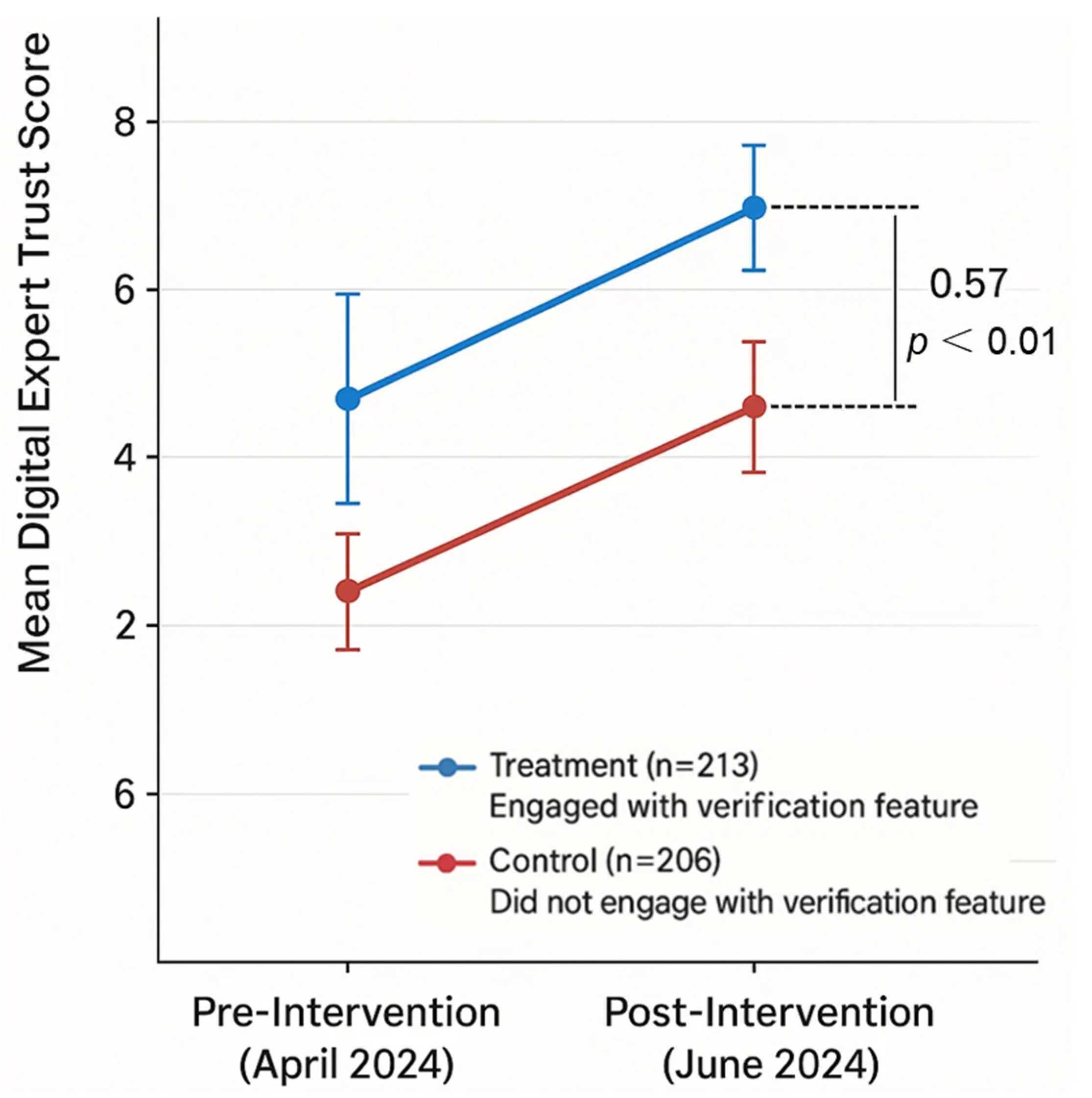 To evaluate the causal impact of the social media platform’s certification upgrade on expert trust, a difference-in-differences (DID) analysis was employed. This quasi-experimental design compares the changes in expert trust over time between a treatment group (users who actively engaged with the new certification system) and a control group (users who did not engage with the feature). The DID model is: