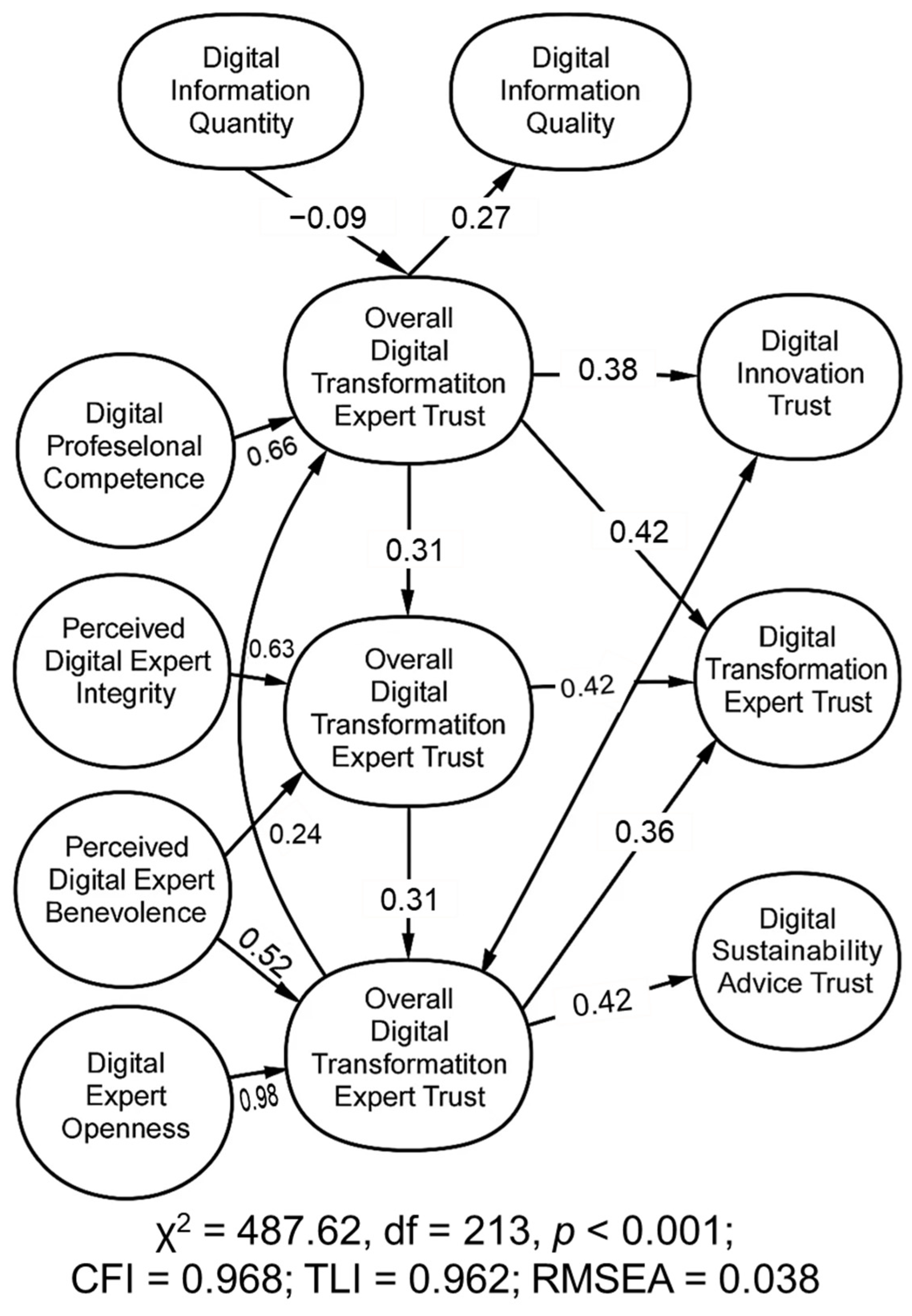 M = 6.59, SD = 1.58). Confirmatory Factor Analysis (CFA) further supported the three-dimensional structure of the digital transformation trust instrument, yielding satisfactory fit indices (χ