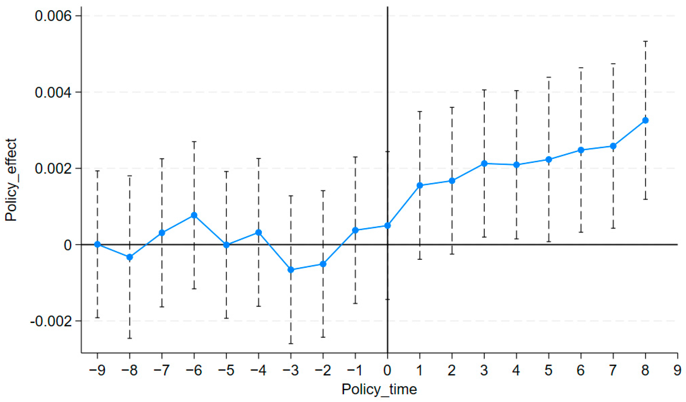 is significantly positive, and all of the estimated coefficients are 0.0017, indicating that the implementation of dual pilot policies improves the city’s ER by 0.17%. Thus, the regression results are consistent with our hypothesis.