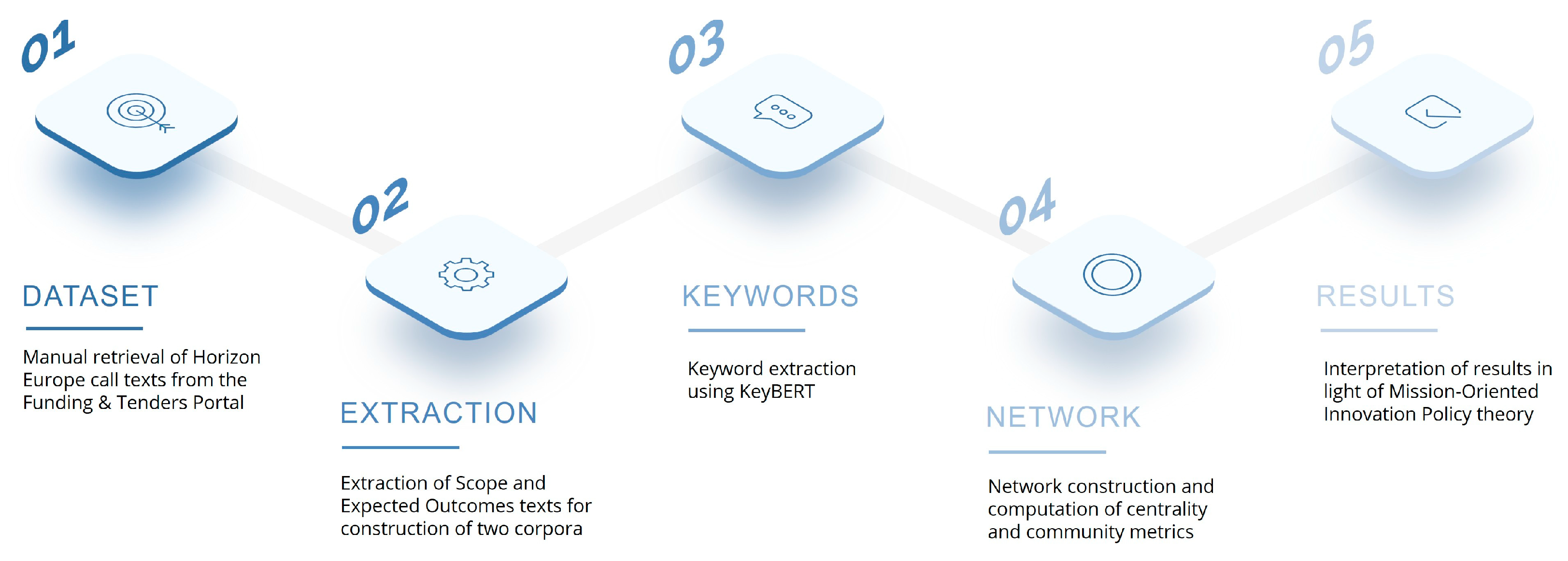 Figure 1 presents the structure of the research process. It illustrates the sequential stages followed: (i) manual retrieval of Horizon Europe call texts from the Funding & Tenders Portal; (ii) construction of two corpora corresponding to Scope and Expected Outcomes sections; (iii) keyword extraction using KeyBERT; (iv) network construction and computation of centrality and community metrics in R; and (v) interpretation of results in light of Mission-Oriented Innovation Policy (MOIP) theory. The framework is transferable to other Work Programmes, clusters, or even national funding schemes, making it broadly applicable beyond the immediate dataset.