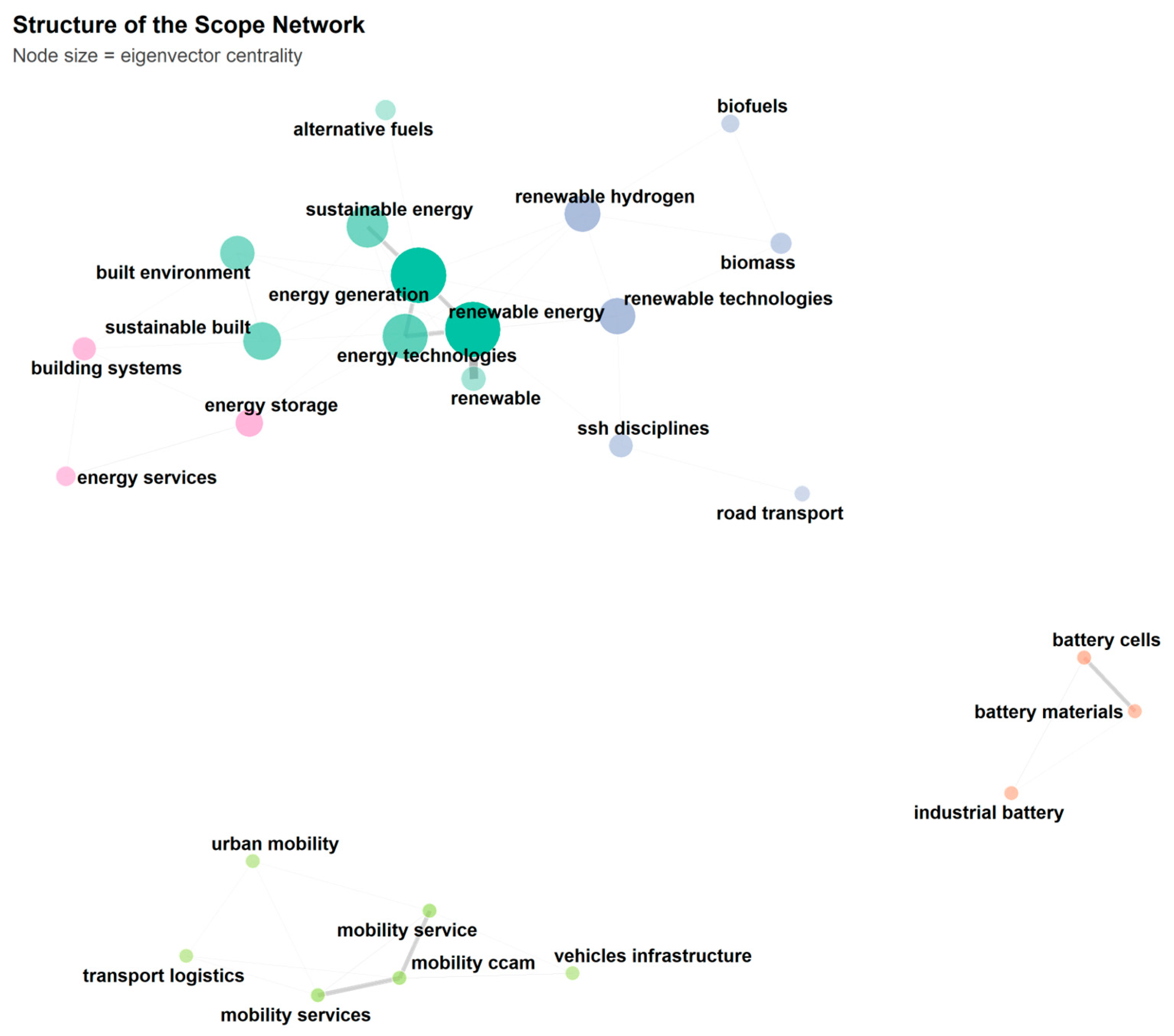 In the Scope network, “energy storage”, “energy generation” and “emissions” show betweenness values several orders of magnitude higher than the average. This high betweenness placed them in structurally strategic positions that connect distinct domains such as renewable technologies, infrastructure, and mobility-related areas. Notably, mobility-related keywords, mostly those concerning transport, infrastructure, and logistics, also showed high centrality values, stressing their importance in the network. “Energy storage”, for example, was identified as a nexus linking technical generation systems (e.g., solar, wind), grid infrastructure, and application domains like buildings and transport.