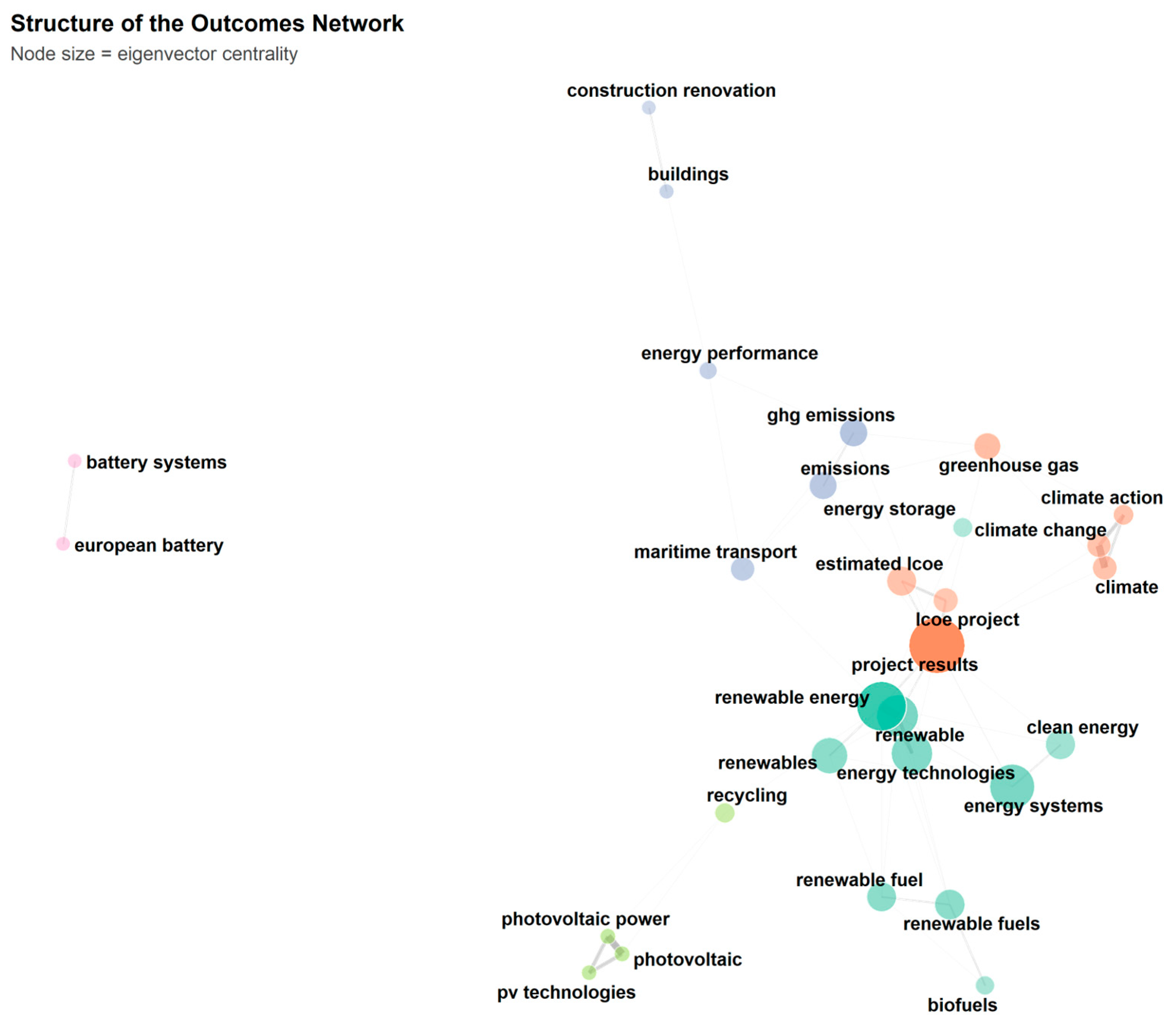 Table 2), where “renewable energy” (with 142 connections), “project results” (119), and “emissions” (98) dominated. The most notable difference was the presence of “project results”, absent from the Scope layer, which seems logical considering its role as an impact-oriented focal point. Complementing the technical specifications detailed in the Scope section, this clearly indicates a turn in the emphasis of the text from research orientation to the delivery of tangible impacts.