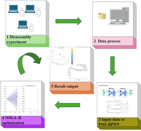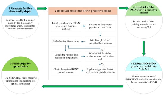 The method proposed in this study can be divided into five main steps, as shown in Figure 1. In the first step, the disassembly parts are numbered, a disassembly directed graph is constructed based on actual disassembly experiments, the disassembly constraint matrix and rules are defined, and feasible disassembly depths are generated. The second step is to optimize the initial weights and biases of the BPNN predictive model by using the PSO. In the third step, the experimental data is randomly divided into training and test sets at a rate of 7:3; the number of training iterations is 1000, the learning rate is 0.01, and the target minimum error is 1 × 10−5. Based on the experimental results, the PSO-BPNN model was established to predict disassembly time, profit, and carbon emissions. In the fourth step, the PSO-BPNN predictive model is embedded into the Non-dominated Sorting Genetic Algorithm (NSGA-II) and uses its predicted outputs as fitness values. In the fifth step, NSGA-II is used for the disassembly depth optimization of EoL smartphones to balance disassembly time, profit, and carbon emissions.