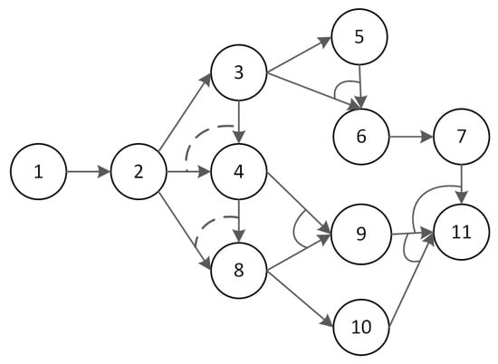 The disassembly precedence graph is commonly used to represent the relationships between parts of the EoL product [], as shown in Figure 2. The disassembly precedence graph is constructed by a human expert based on a physical teardown analysis, and the precedence graph truly reflects the constraints in the actual disassembly. A single-direction arrow represents constraint relationships between parts—for example, an arrow from part 1 to part 2 means part 1 must be disassembled before part 2. A solid arc represents an ‘AND’ priority relationship, which means all preceding disassembly tasks need to be completed before subsequent disassembly can begin. A dashed arc represents an ‘OR’ priority relationship, where subsequent disassembly tasks can proceed as soon as any one preceding task is finished. The disassembly precedence graph can be represented by the constraint matrix P.