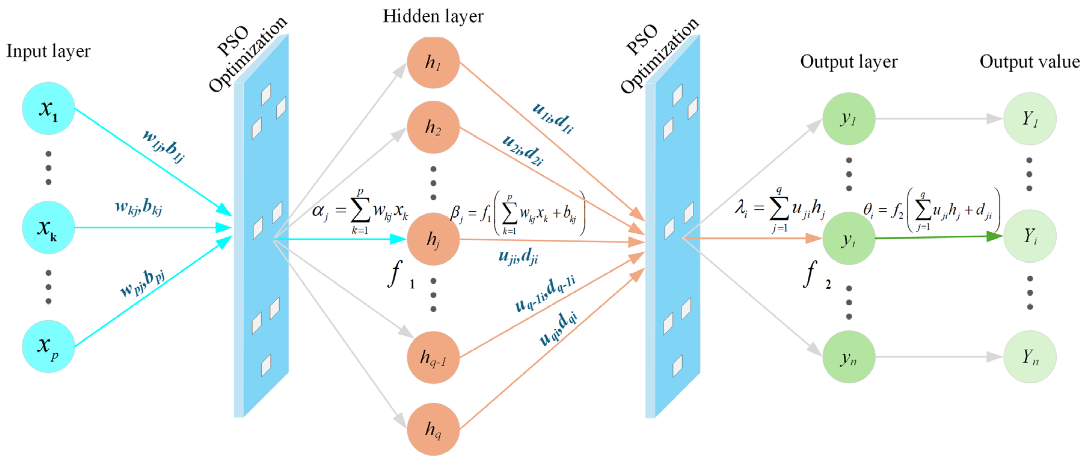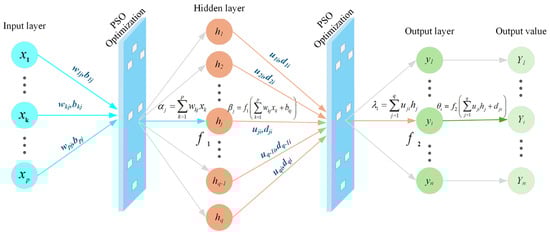 The BPNN is a typical multi-layer feedforward artificial neural network trained using the error backpropagation algorithm. The core principle of BPNN involves a two-phase process: a forward pass, where input signals are processed layer-by-layer to generate an output, and a back pass, where the error between the actual output and the target is calculated and propagated backward through the network. Through this iterative process, the connection weights and biases of each neuron are adjusted to minimize the error. The BPNN model mainly consists of the input layer, hidden layers, and output layer []. Random initial weights and biases in the BPNN predictive model often results in a slow convergence speed, high MSE, and prediction inaccuracies. Therefore, this study uses PSO to optimize the weights and biases of the BPNN predictive model. Figure 3 illustrates the topological structure graph of the PSO-BPNN model.