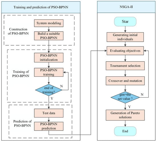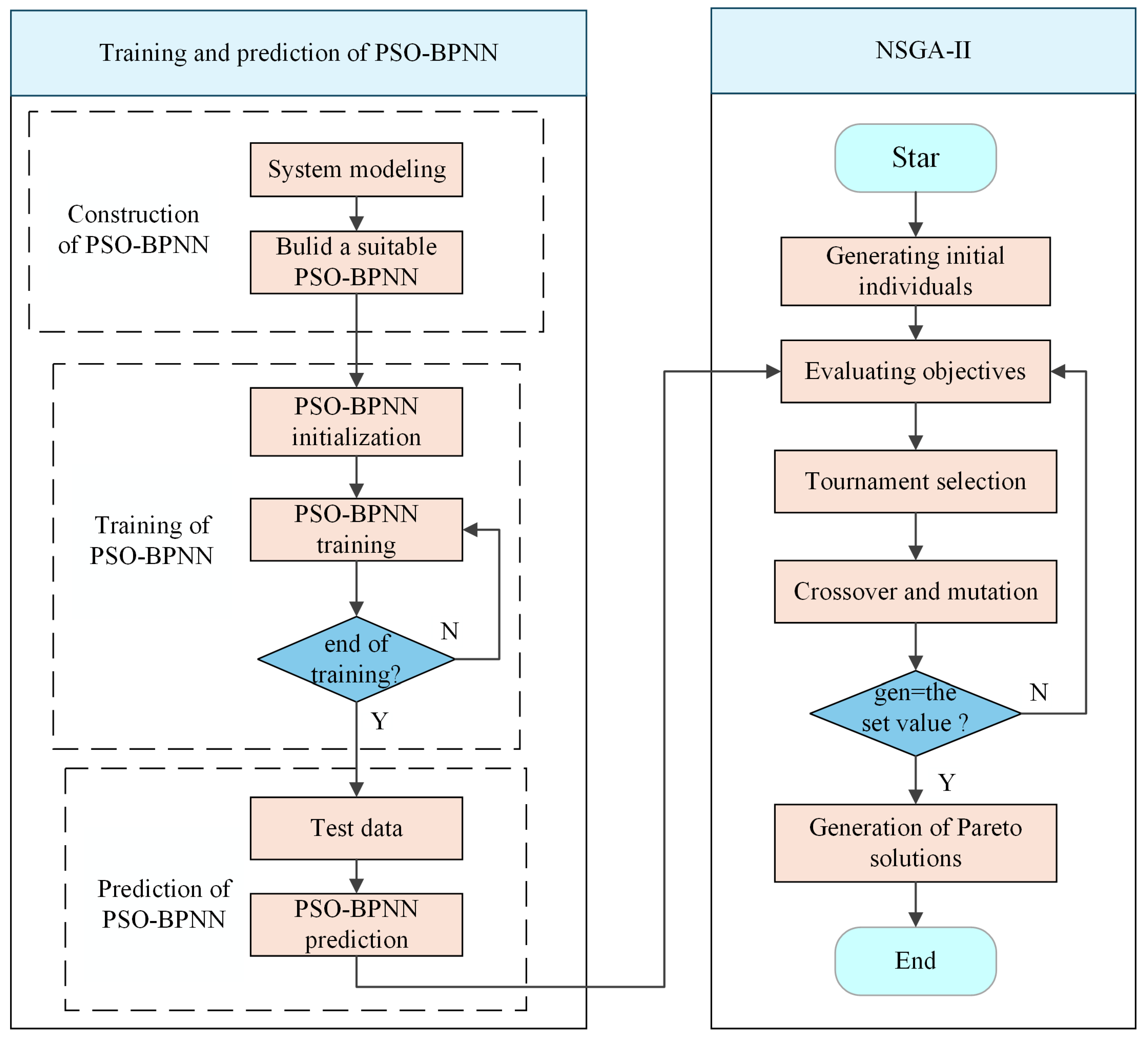 The algorithm flow chart of embedding PSO-BPNN into NSGA-II.