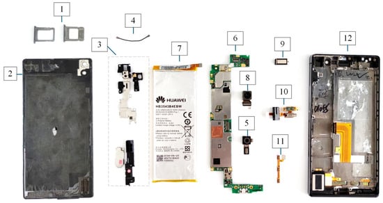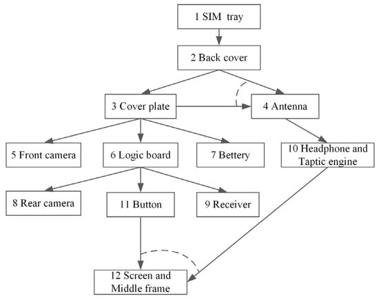 The disassembly rules for EoL smartphones were established as follows []: (1) the disassembly of parts with a high recycling value; (2) the disassembly of parts with a high environmental pollution impact; (3) the disassembly of parts that require the same disassembly tool; and (4) the disassembly of parts with the same attributes.