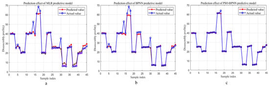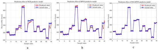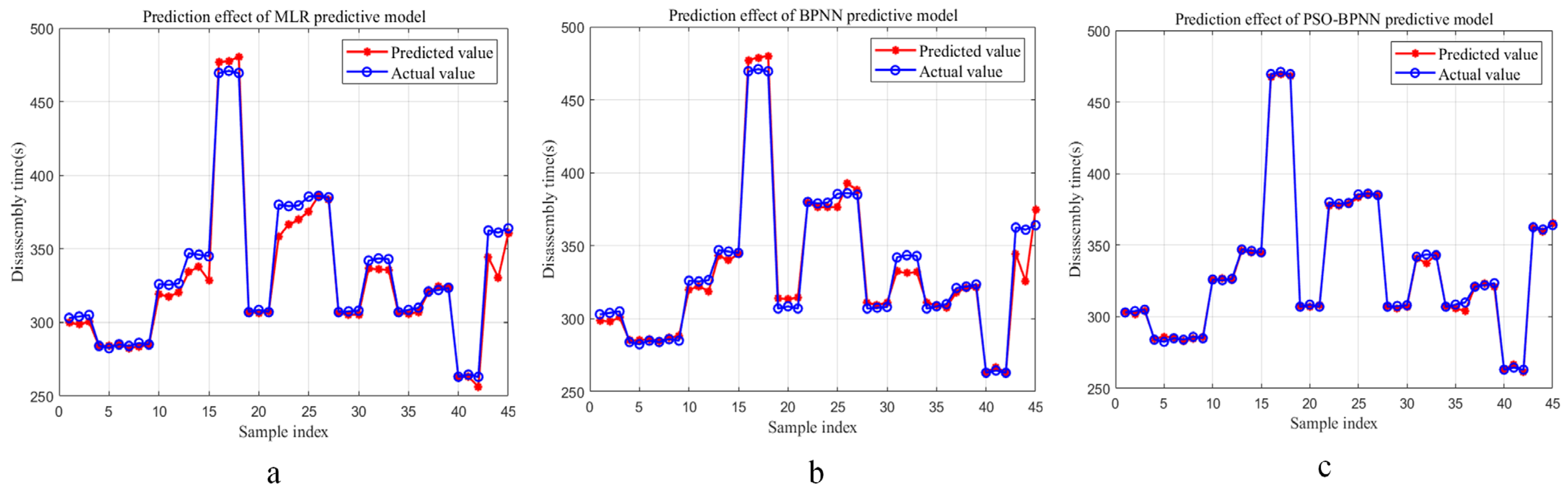 In the first experimental group, 150 sets of data were selected, and the training set and the test set were divided into a ratio of 7:3 for verification. The input and output samples were trained by the PSO-BPNN and BPNN predictive models to establish the network relationships between inputs and corresponding outputs. Figure 8 shows the disassembly time prediction results for the three models on the test set. As shown in Figure 8a, the MLR predictive model exhibits a poor predictive accuracy. In Figure 8b, the BPNN predictive model exhibits a significant prediction bias for samples 43 to 45. In contrast, Figure 8c shows that the PSO-BPNN predictive model maintains a strong agreement between the predictive values and actual values across all samples. According to Equation (10), the MSE values for the MLR, BPNN, and PSO-BPNN predictive models are calculated as 66.523, 58.022, and 4.083, respectively. Compared to the BPNN predictive model, the PSO-BPNN predictive model achieves an approximately 92.95% reduction in MSE. Therefore, the predictive model established based on PSO-BPNN was effective in the first group experiment.