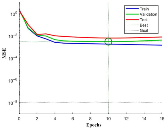The accuracy of the PSO-BPNN predictive model for disassembly time, disassembly profit, and disassembly carbon emissions does not reach 100% for some reasons. Firstly, as a data-driven approximate model, the predictive ability of PSO-BPNN is limited by the network structure and optimization algorithms. If the number of network layers is too small or the number of neurons is insufficient, the model may not be able to fully learn complex data patterns, and the network may not converge. Secondly, the small number of samples may result in poor model training with regard to the predictive ability. In addition, the learning rate curve of the proposed model is shown in Figure 12. In the initial 0–3 epochs, both the training and validation errors decreased rapidly, indicating that the model is effectively learning the features of the data. Between epochs 3 and 10, the error rate slows down as the model converged, with the validation error achieving the optimal performance. From epoch 10 to 6, the training error continues to decrease slightly, but the validation and test errors begin to increase marginally, indicating that the model continues to fit the training set. The training error has been reduced to a very low level (at an order of 10−3) and is significantly lower than in the initial stage. Therefore, the model does not suffer from severe underfitting. After the 10th epoch, the training error continues to decrease, while the validation and test errors stabilized or slightly increased, which are signs of overfitting.