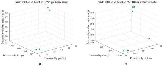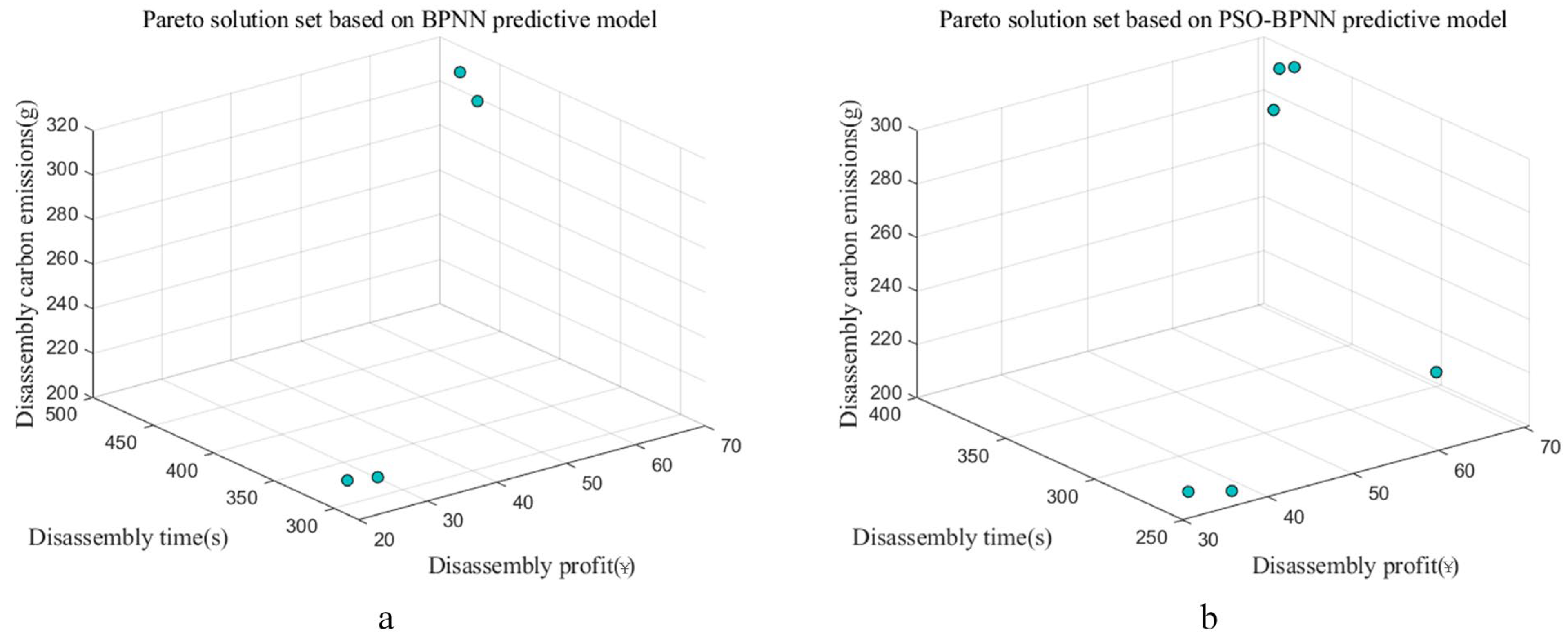 Firstly, this section discusses the predictive performance of the PSO-BPNN predictive model for the disassembly time, profit, and carbon emissions of EoL smartphones. The comparative analysis demonstrates that the superior performance of the PSO-BPNN predictive model is better than the BPNN predictive model. Secondly, for the disassembly depth optimization of EoL smartphones, the superior pareto solutions are obtained by the proposed method.
