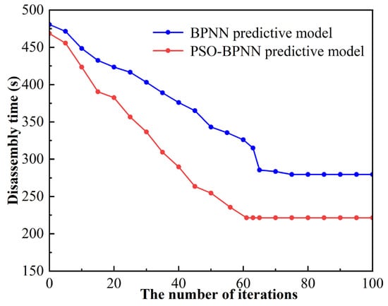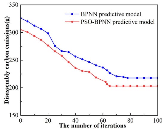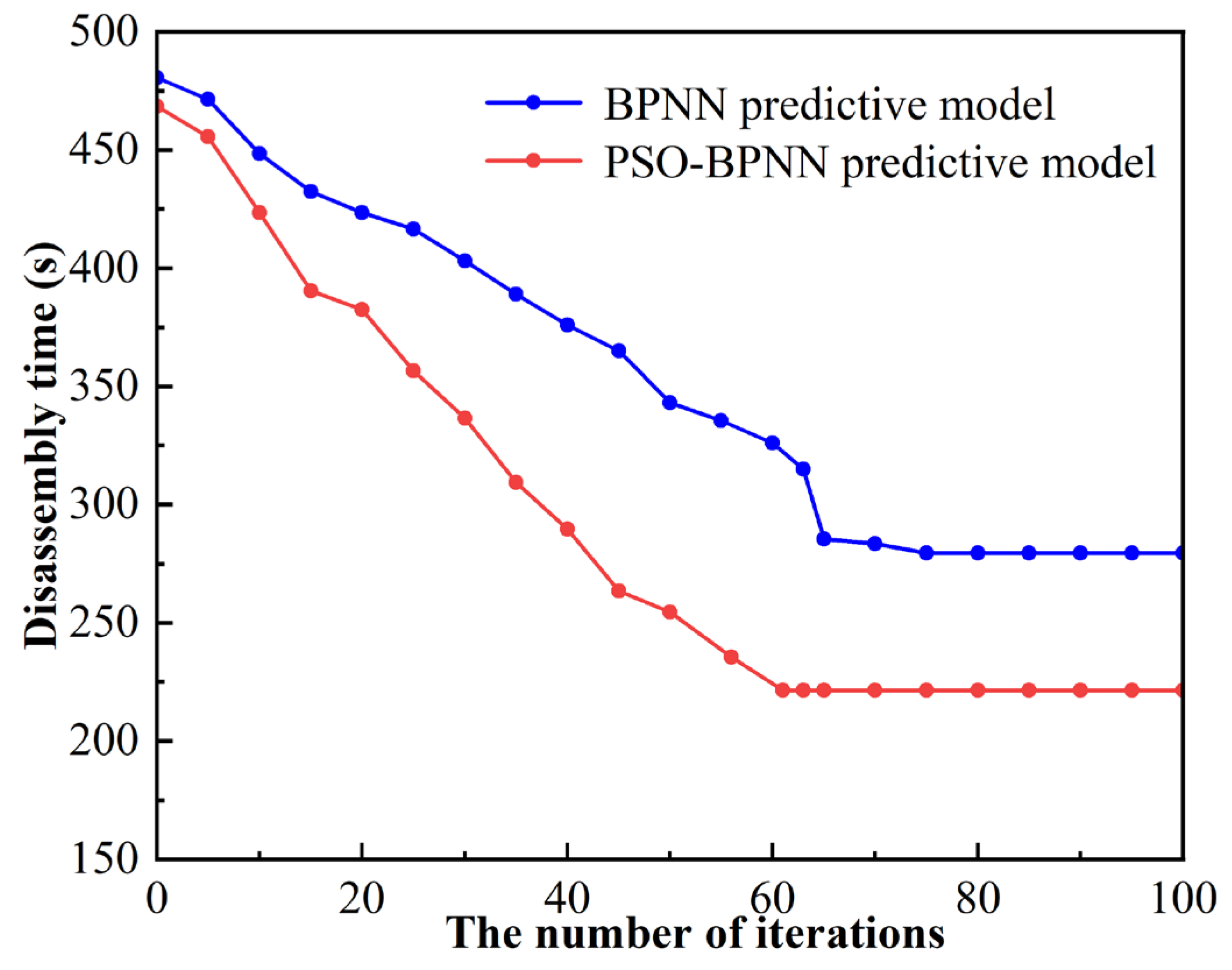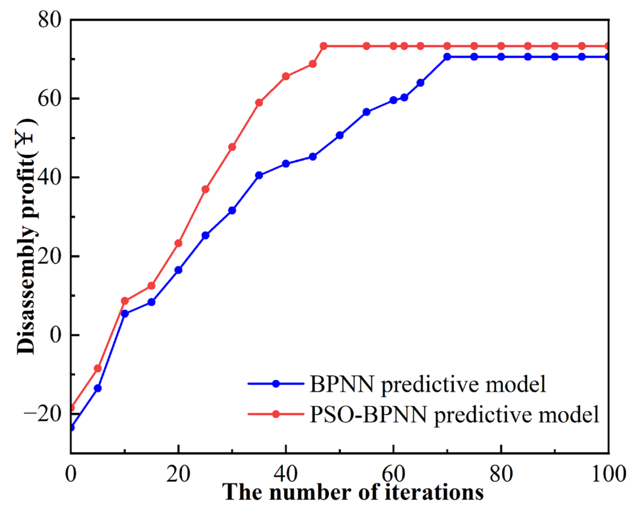 During the process of searching for the optimized solutions of disassembly time, as shown in Figure 14, the PSO-BPNN predictive model tends to converge at the 61-th generation, compared to the 75-th generation for the BPNN predictive model, which represents an 18.6% improvement in convergence speed. Figure 15 shows, that in the process of searching for an optimized disassembly profit, the PSO-BPNN predictive model converges at the 47-th generation, compared to the 70-th generation for the BPNN predictive model, which represents a 32.8% improvement in convergence speed. Figure 16 shows that, in the process of searching for optimized disassembly carbon emissions, the PSO-BPNN predictive model converges at the 65-th generation, compared to the 78-th generation for the BPNN predictive model, which represents a 16.6% improvement in convergence speed.