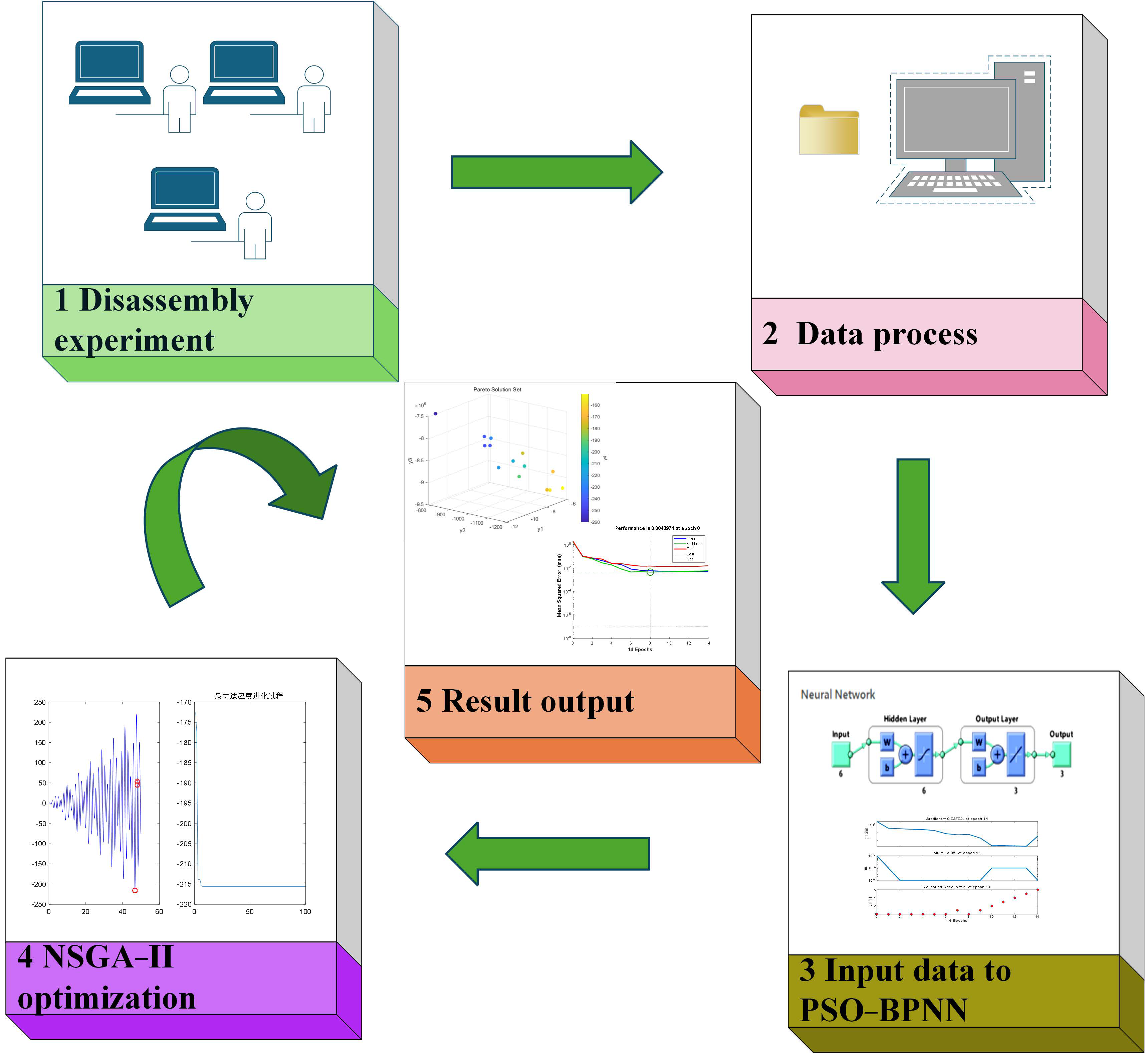 Step 1: Establish the predictive model for disassembly time, profit, and carbon emissions, respectively.