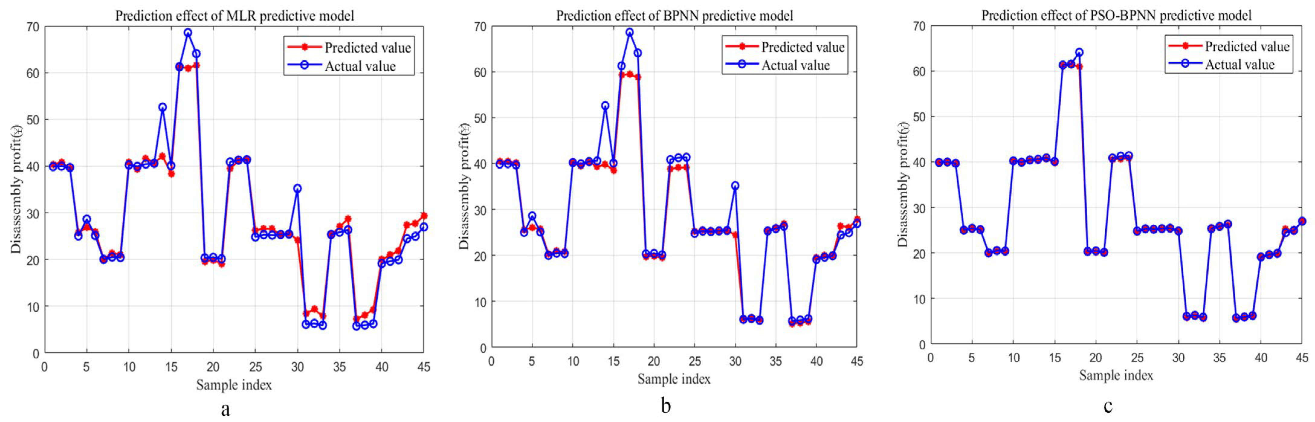Disassembly profit prediction results ((a) MLR; (b) BPNN; (c) PSO-BPNN).