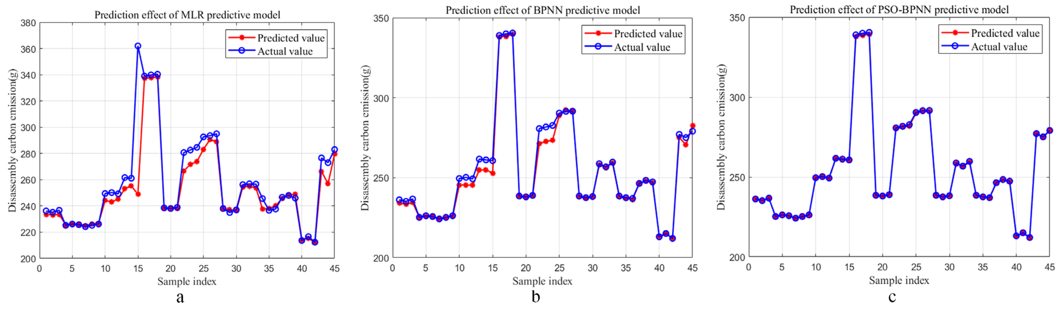 Disassembly carbon emissions prediction results ((a) MLR; (b) BPNN; (c) PSO-BPNN).