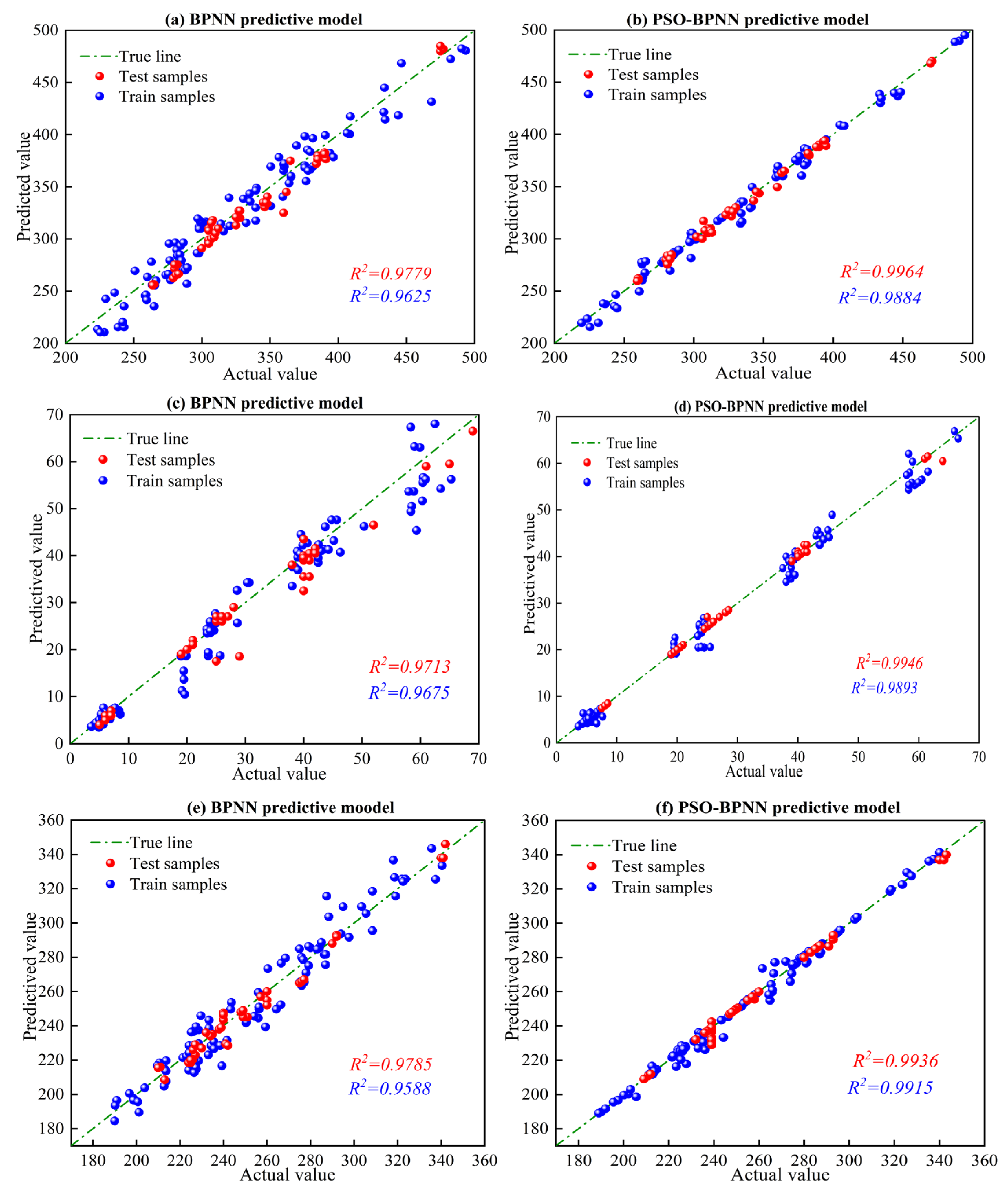 Three groups of experiments were conducted to verify the predictive performance of the PSO-BPNN predictive model. Furthermore, to provide a baseline reference, the multiple linear regression (MLR) predictive model was also compared with the BPNN predictive model and PSO-BPNN predictive model.