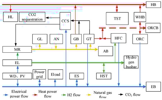 Flow of energy and matter. We explicitly describe the core flows: electrical flow: from PV/WT/Grid, through converters (P2G, EL), to electrical loads and storage (ES). Gas flow: from the superior gas grid and the methane reactor (MR), through gas turbines (GT) and gas boilers (GB), to gas loads. Hydrogen flow: from electrolyzers (AWE, PEM) to storage (HST) and then to hydrogen fuel cells (HFC) or the methane reactor (MR). Heat flow: from cogeneration units (GT, HFC, GB), waste heat recovery (WHB, ORC), to heat loads and storage (TST). CO2 flow: from the gas turbine’s flue gas to the carbon capture system (CCS) and then to the methane reactor for utilization or to storage.