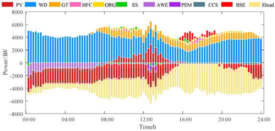 Table 1, it can be seen that scenario 1 only deploys gas units, does not build a cogeneration system, and lacks technical means such as electricity-to-gas, resulting in significantly high gas grid interaction costs. Scenario 2 integrates carbon capture technology on the basis of scenario 1 and directly converts electrolyzed hydrogen into natural gas for utilization, which effectively reduces natural gas procurement expenditure by supplementing gas sources, reducing the gas grid interaction cost to 108,204.95 CNY. However, due to the constraints of the carbon trading mechanism, the additional carbon purchase cost was 1576.83 CNY. Scenario 3 uses two-stage power-to-gas (P2G) technology to introduce hydrogen fuel cells and ORC cryogenic power generation devices to build a cogeneration system, although the complexity of the system increases and changes the natural gas demand structure, resulting in the gas grid interaction cost rising to 113,808.10 CNY, however, its grid interaction cost is −59,777.26 CNY, achieving significant benefits, which is attributed to the fact that the cogeneration system improves energy utilization efficiency and grid interaction benefits through energy allocation optimization and interactive collaboration.