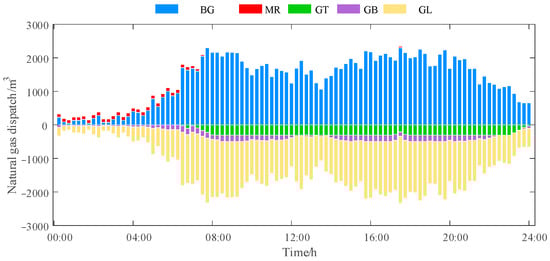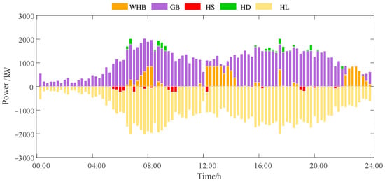 Figure 4 illustrates the pivotal role of the gas network in multi-energy conversion. During 00:00–04:00, due to the low heat demand for production and life, the gas boiler maintains the basic heat supply in a fluctuating mode, the power of the waste heat boiler is small, and the heat storage device intermittently carries out heat storage with small power. From 06:00 onwards, the heat load starts to rise, the power of the gas boiler increases significantly, the power of the waste heat boiler increases synchronously, and the heat storage tank participates in heat storage during part of the time period. During 08:00–20:00, accompanied by a continuous growth or fluctuation of the heat from 08:00 to 20:00, along with the continuous growth or fluctuation of heat load, gas boilers, waste heat boilers, and heat storage tanks operate synergistically to increase the heat supply. The methane reactor increased its output around 20:00. This strategic arrangement responded to the anticipated growth in gas load while leveraging its time-varying operational characteristics to participate in system regulation. Throughout the entire scheduling process, the natural gas system ensured gas volume balance and operational safety for the multi-energy system through the dual safeguards of “purchased gas + P2G gas production”.