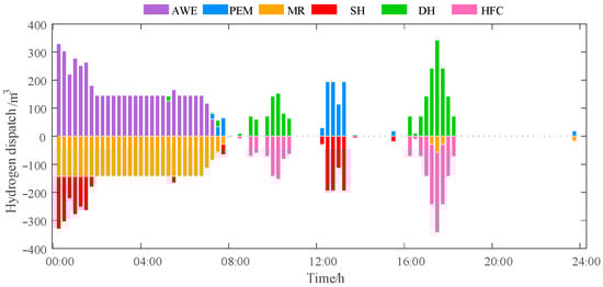 Figure 5 illustrates the core value of hydrogen energy dispatch in energy conversion. Between 00:00 and 04:00, alkaline electrolyzers maximize low-cost wind power for large-scale hydrogen production while proton exchange membrane electrolyzers remain on standby. This differentiated operation demonstrates the system’s precise control over hydrogen production economics. Simultaneously, methane reactors continuously consume hydrogen to synthesize natural gas, while hydrogen storage tanks handle surplus storage, forming a complete “production-storage-consumption” hydrogen management chain. Between 14:00 and 16:00, PEM electrolyzers significantly increase output—aligned with their rapid response characteristics—to smooth power fluctuations during this period. During the peak hydrogen consumption period from 18:00 to 20:00, the system achieved precise matching of hydrogen supply and demand by coordinating electrolyzer load reduction, hydrogen fuel cell power generation, and hydrogen tank release. This multi-timescale hydrogen management strategy fully demonstrates hydrogen’s critical role in enhancing system flexibility and facilitating renewable energy integration.