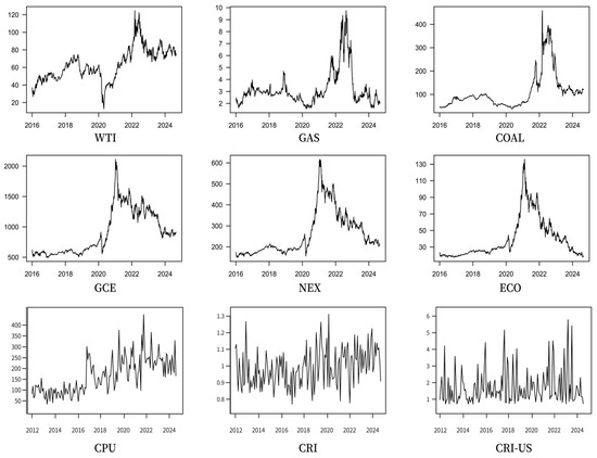Unlike Gu et al. [28], who compute the global CRI using a subset of developed countries, we construct a monthly global CRI by averaging across all 211 countries. The variable definitions and measurement methods are provided in Table 1, and summary statistics are presented in Table 2. Figure 1 illustrates the time-series trends for selected variables.